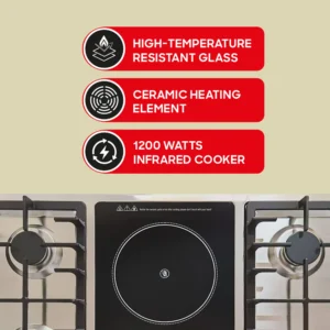 This single burner infrared cooker offers a modern and versatile cooking solution. It features a durable, high-temperature-resistant glass surface (284x295mm) and a sleek stainless steel body. The ceramic heating element ensures even heat distribution, while the convenient knob control allows for easy adjustments. The digital LED display shows settings and a timer function for precise…