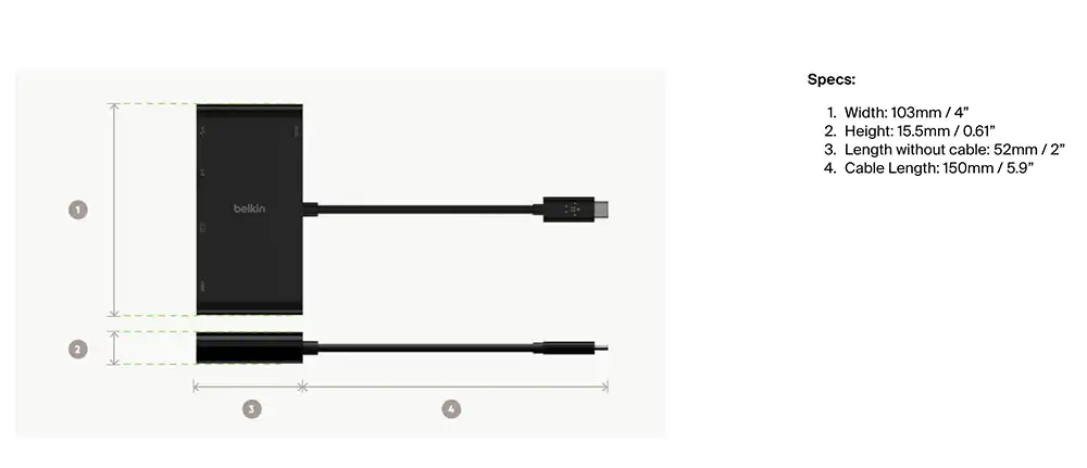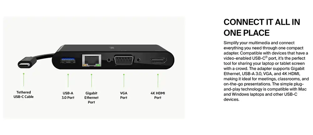 The Belkin USB-C Multimedia Adapter, AVC005 simplifies your multimedia setup with a single compact hub. Compatible with devices that have a video-enabled USB-C® port, it’s perfect for sharing your laptop or tablet screen with a crowd so it’s very convenient for meetings, auditoriums, classrooms, and on-the-go presentations.