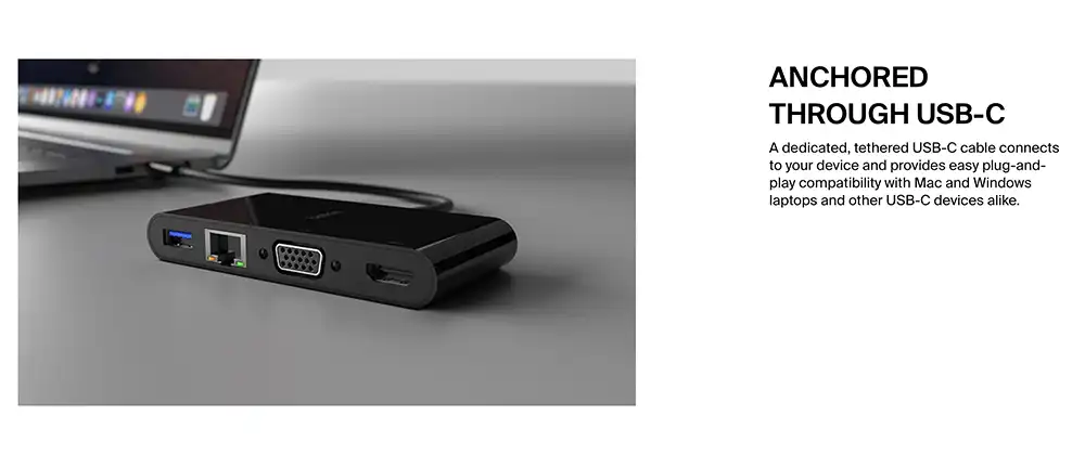 Single adapter for charging and sharing for easy and hassle-free connection | Tethered USB-C cable for simple plug-and-play connection | HDMI® output supports up to 4K at 30 Hz resolution | VGA output supports up to 1920×1200 at 60 Hz resolution | Gigabit ethernet port | USB-A 3.0 port supports 900mA output