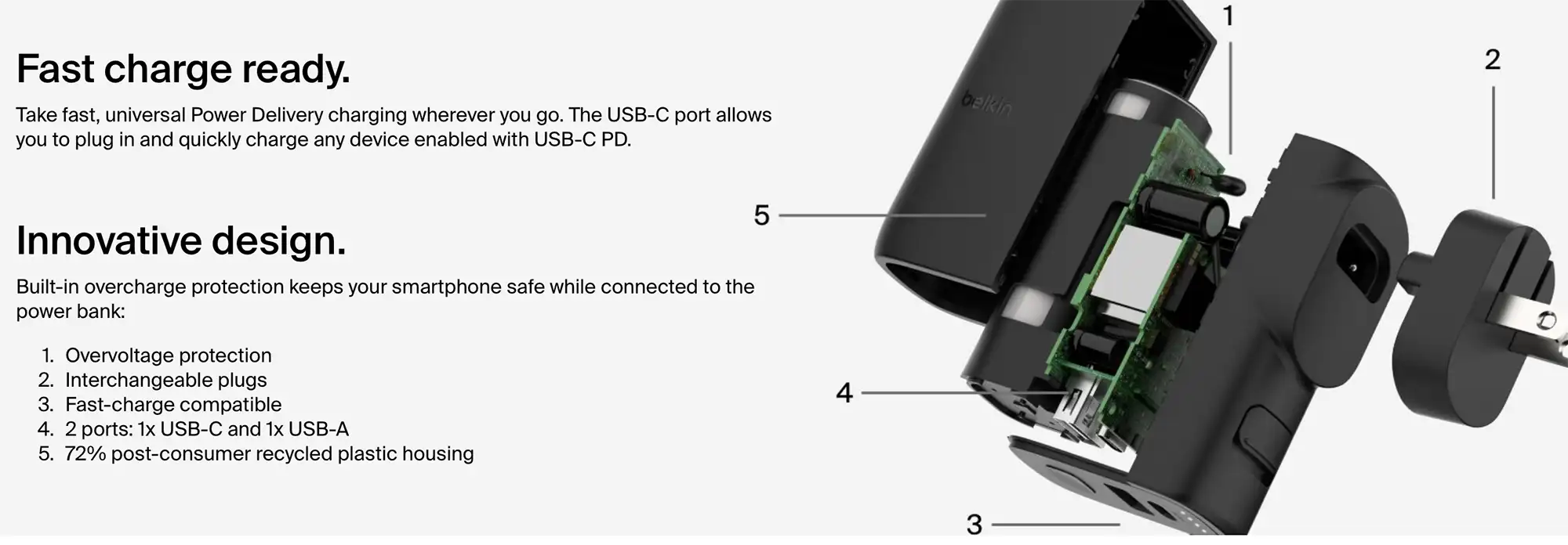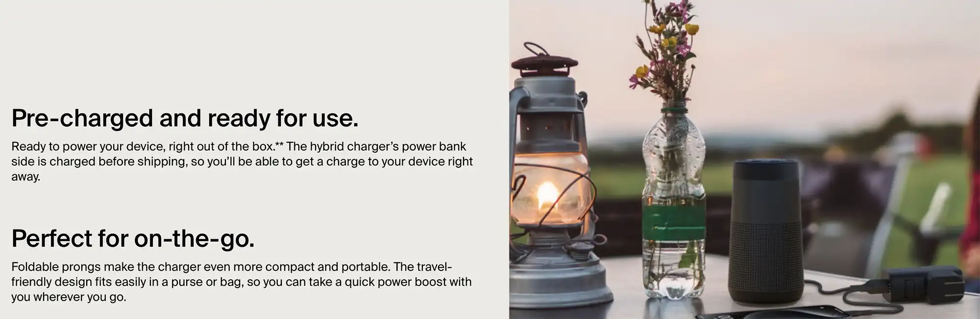 Our Hybrid Wall Charger 25W + Power Bank 5K§ is the perfect travel companion. It’s a super-compact portable charger that features a USB-C® and USB-A charging ports. Use it as a power bank as you’re on-the-go and a wall charger when back at your hotel. The integrated PD3.0 PPS technology provides safe high-speed charging to almost all USB and PD-enabled devices.