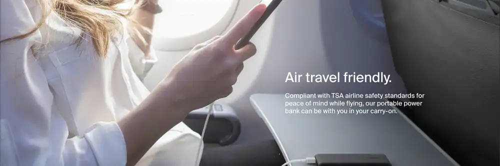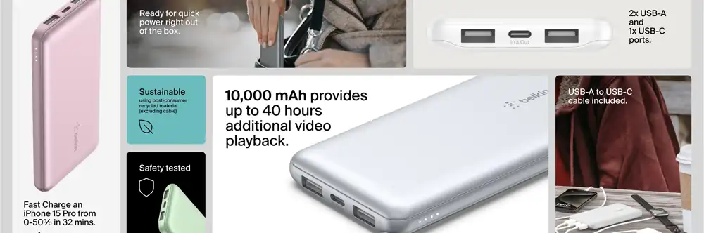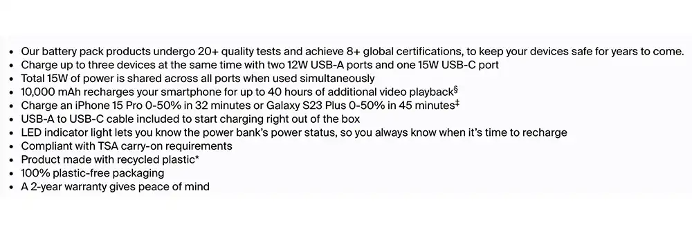 Charge 3 Devices at Once. Two USB-A ports and one USB-C port keep all your devices charged, providing up to 15W of power for your smartphone and two other accessories. Charge at up to 15W when using all 3 ports, adding up to an additional 40* hours of battery life for your smartphone. Binge watch movies, take video calls, and keep your navigation apps running all the way to your destination. An LED light indicates when the power bank needs recharging, and the included USB-A to USB-C cable lets you start charging right out of the box. 10,000 mAh provides 40* extra hours of battery life for your smartphone. Charge up to 3 devices at once with up to 15W combined. 2 USB-A ports, 1 USB-C port. USB-A to USB-C cable included. LED light indicates when portable charger needs recharging.