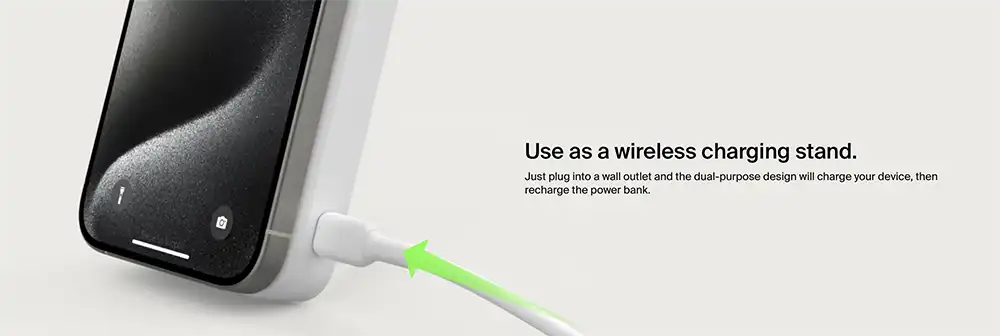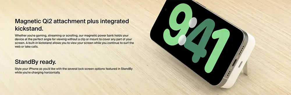 Wirelessly charge iPhone and other Qi2-enabled smartphones quickly and safely with our BoostCharge Pro Magnetic Power Bank with Qi2 15W 5K§. Your Qi2 and MagSafe compatible devices will have easy and seamless on-the-go charging up to 15W. Watch video, stream or create content at the perfect viewing angle with the integrated kickstand — even while your device is charging.