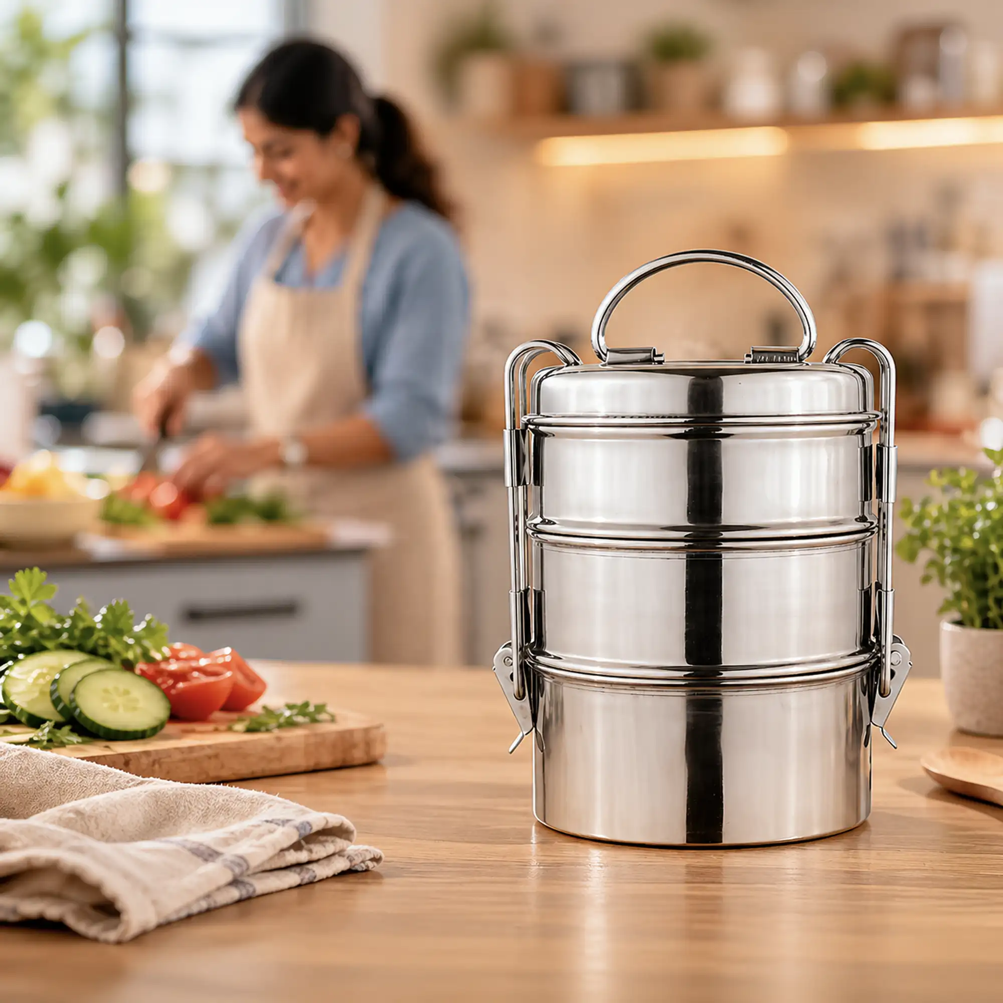 This Stainless Steel Clip Tiffin Box Combo offers a convenient and practical solution for packing lunches for school, office, or travel. It includes two lunch boxes, one with three tiers and one with two tiers, both crafted from high-quality stainless steel and featuring secure clip closures for effortless carrying. The lunch boxes provide ample space to accommodate a variety of foods, making them ideal for packing a balanced and nutritious meal.