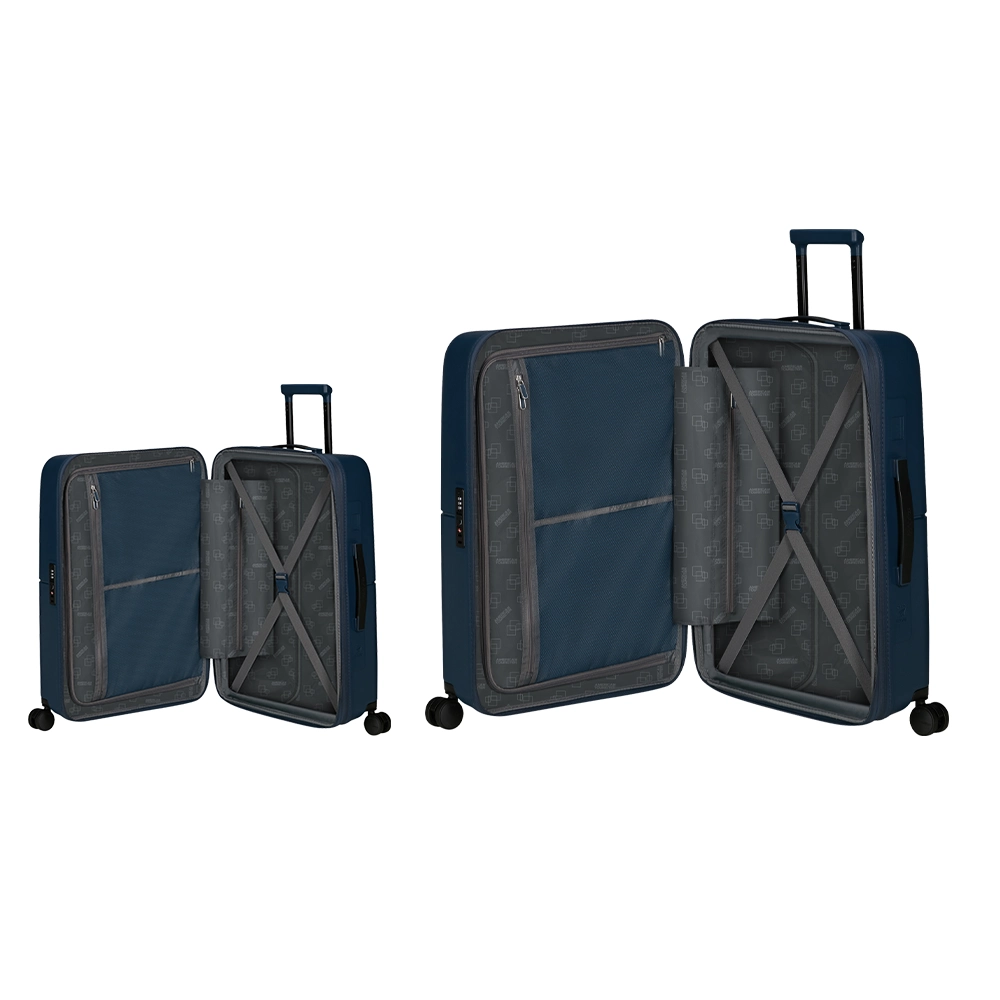 Medium Dimension: 67 x 45 x 28 cm • Volume: 76/84L • Weight: 3.3 kg • Expandable: cm • Zippers: Yes • Wheels Type: Double Wheels • Bottom Grip: Yes • Interior: 100% by weight of the interior fabric and zipper are made with post-consumer recycled PET plastic using 13 recycled bottles of 500ml.