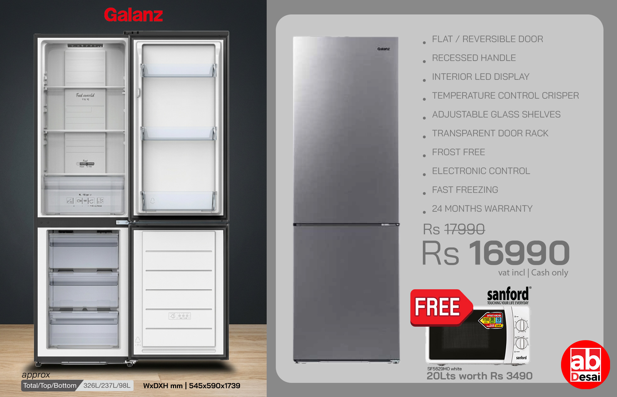 GALANZ Refrigerator Bottom Freezer No Frost Galanz BCD250WE-53H + Free Sanford 20Lts Microwave