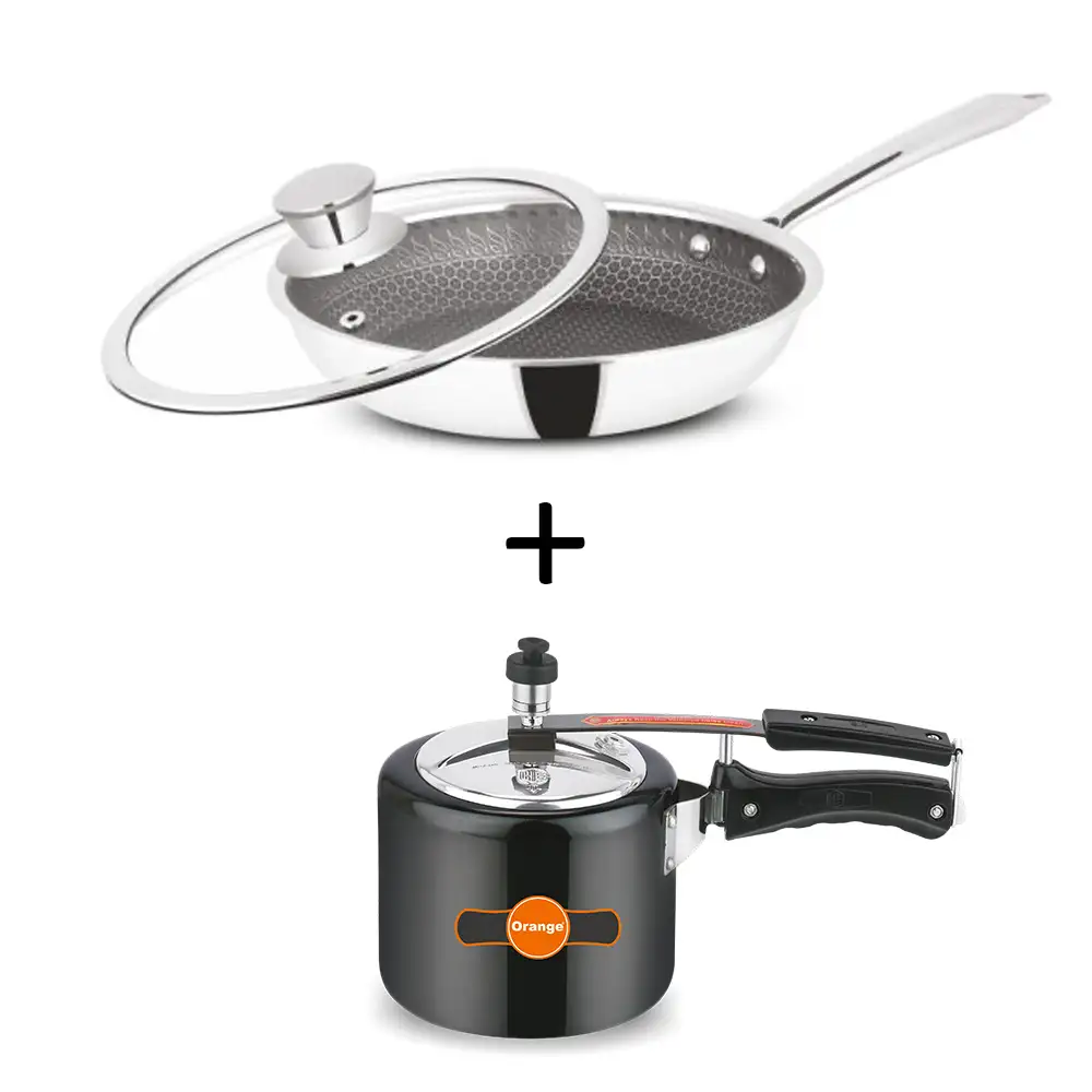 ORANGE Bundle Non Stick Stainless Steel Honey Comb Fry Pan 24cm Induction Friendly (ORA165) + Pressure Cooker 3 Lts (ORA120)