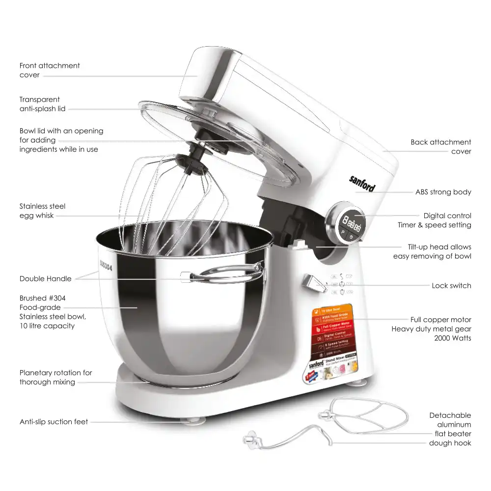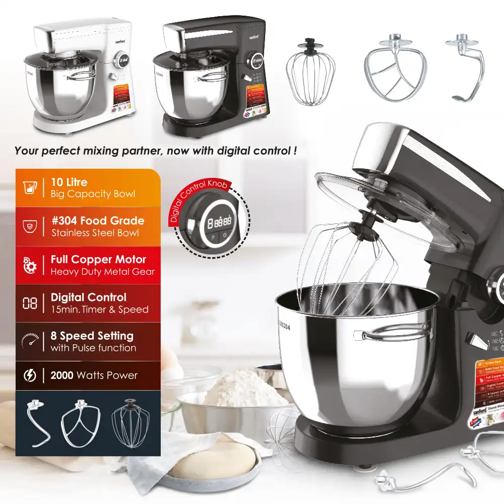 - 2000 Watts, Detachable Aluminium Dough Hook, Flat Beater and Stainless Steel Whisk