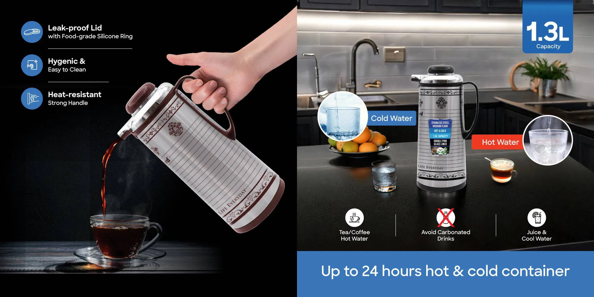 The 1.3L Vacuum Insulated Flask is a high-quality, durable container designed to keep your beverages at the perfect temperature for up to 24 hours. Featuring advanced double pink glass liner vacuum technology, it ensures maximum heat or cold retention. The leak-proof lid with a food-grade dual silicone ring prevents spills, while the cool touch body and heat-resistant handle provide safe and comfortable handling.