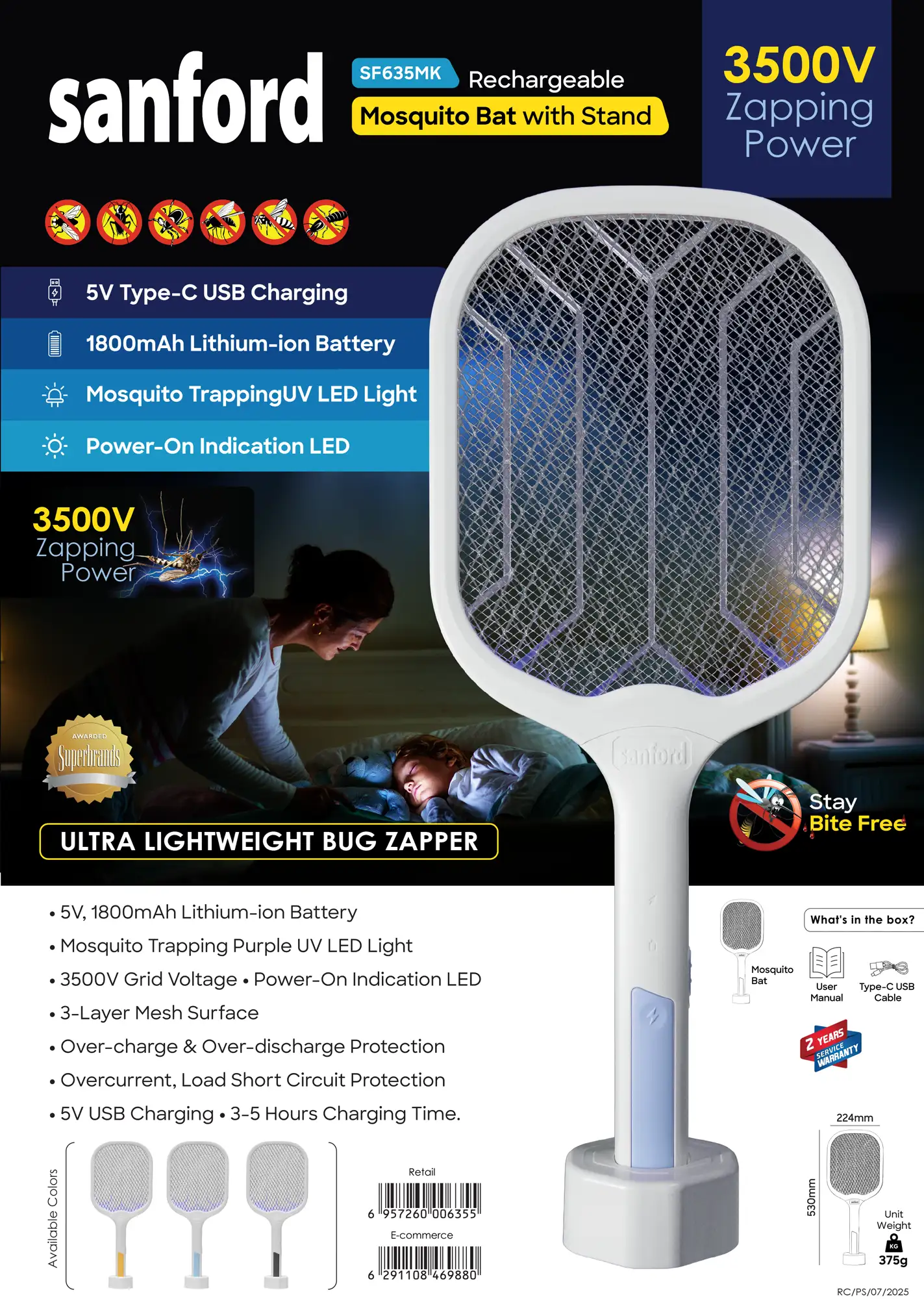 Protect your family with the Sanford Rechargeable Mosquito Bat with Stand (SF635MK), engineered for safe and efficient mosquito control. Equipped with a 3500V high-voltage zapping grid and an advanced UV LED mosquito trapping light, it eliminates flying insects instantly and effectively. Its lightweight design with a dedicated stand ensures convenience and easy storage.