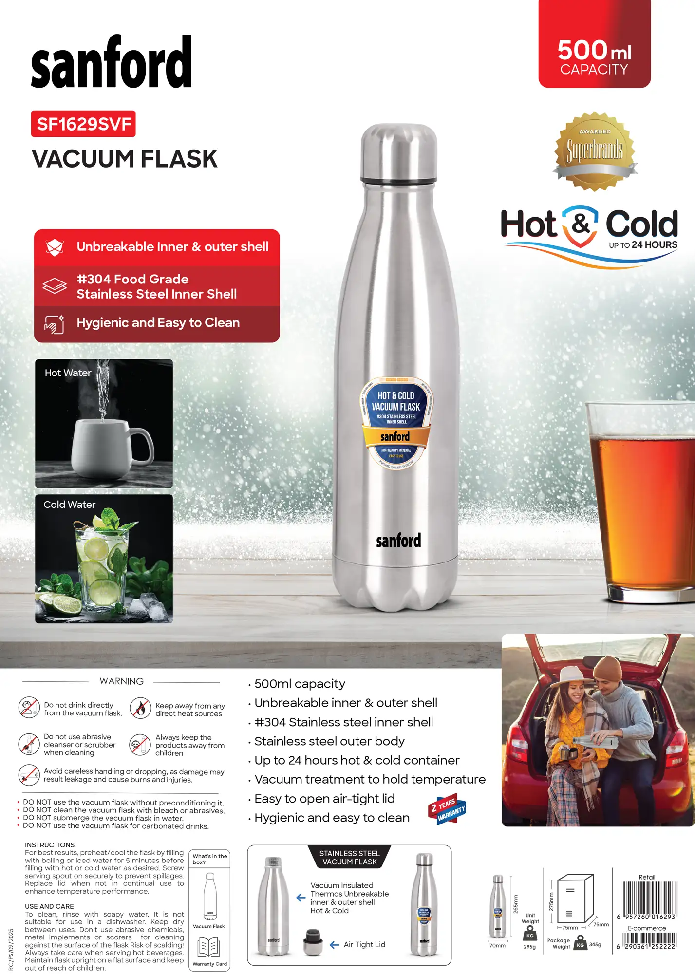SANFORD Vacuum Flask 500ML HOT-COLD Stainless Steel SF1629SVF (Get 2 units at Rs 1200)