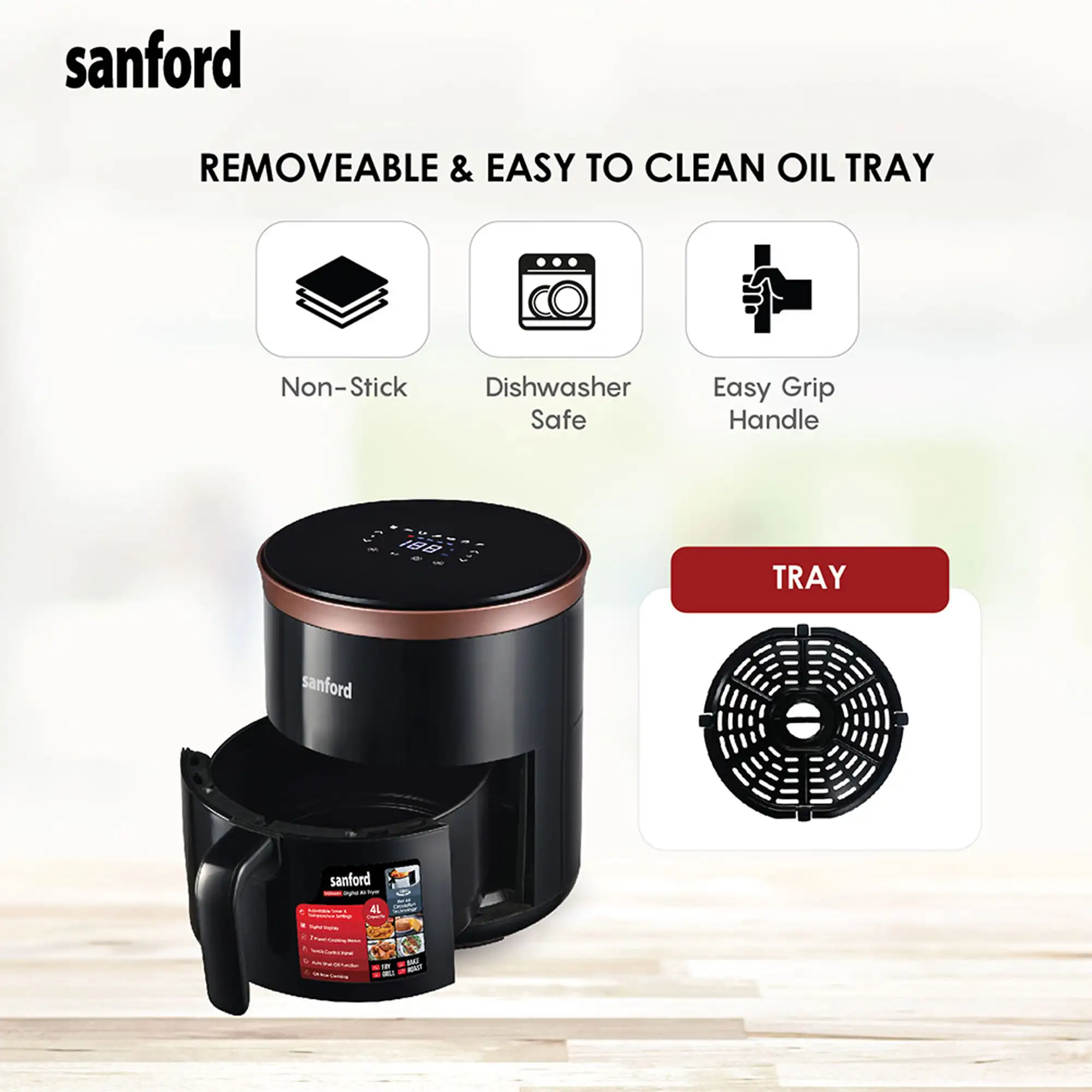 - Non-stick, detachable oil tray for hassle-free cleaning.