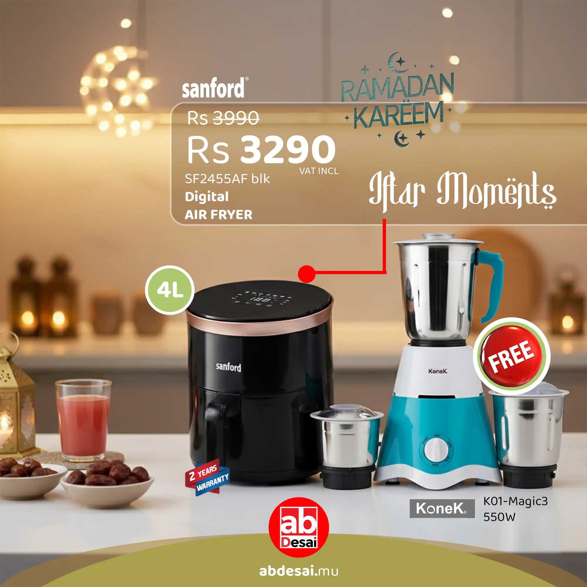SANFORD 4L Digital Air Fryer with LED Display and Non-Stick Basket SF2455AF Black + Free Mixer Grinder K01 worth Rs 1990