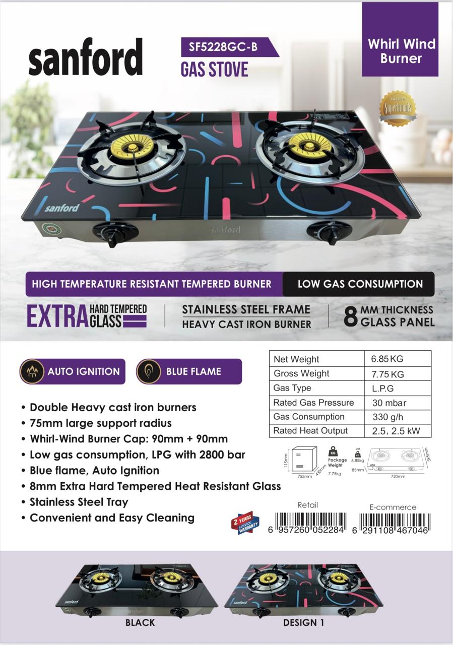 SANFORD Gas Stove Tempered Glass 2 Burners SF5228GC-B Design1 + Free Box Fan worth Rs 1390 K1202B