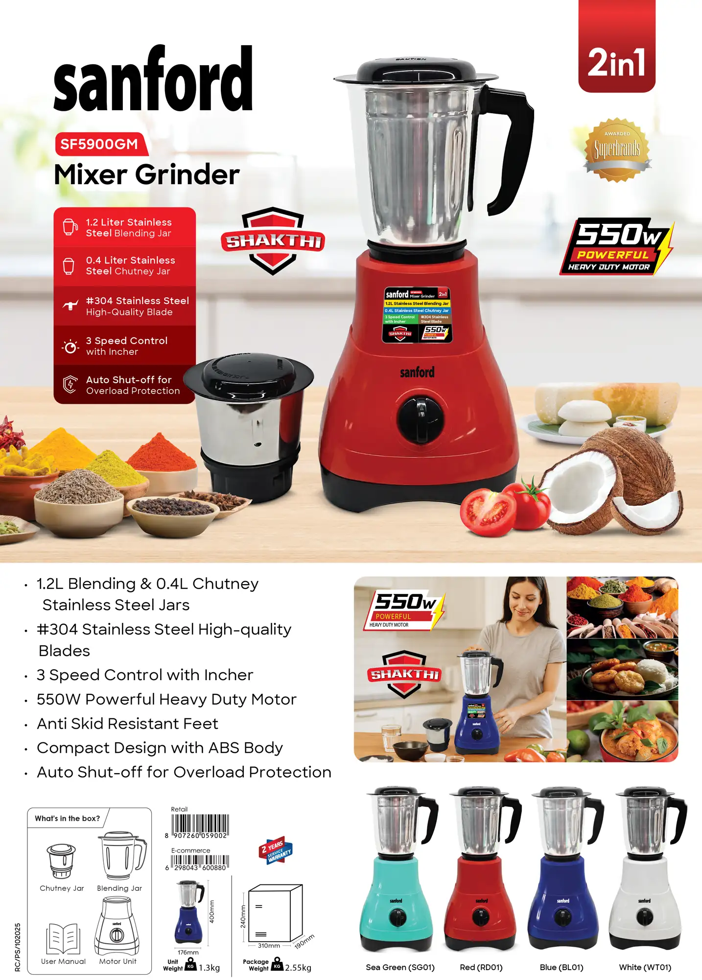 SANFORD Mixer Grinder 550W SF5900GM (as per availability of colour) + Free SF1333HM Rechargeable Hand Mixer