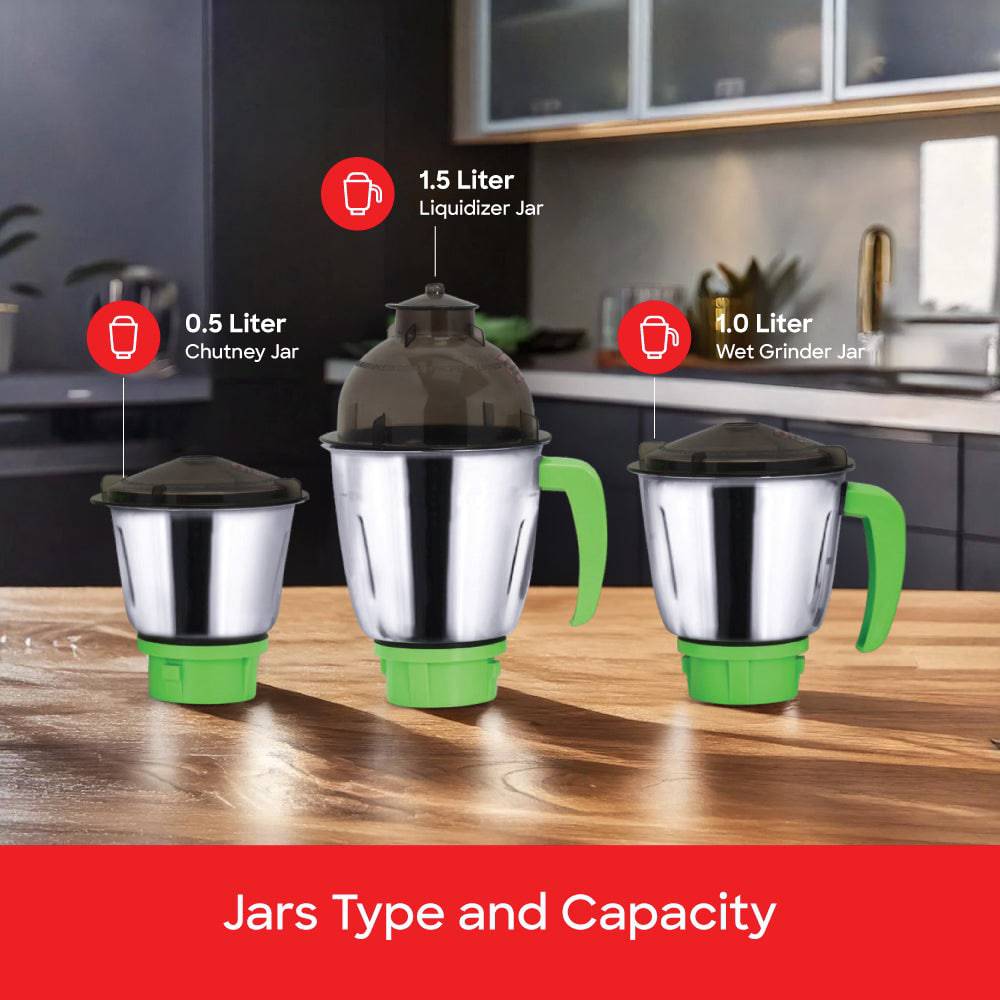 - 1.5L, 1.0L, 0.5L Matte Finish Jars – Comes with three durable, stylish jars for different batch sizes, including a large 1.5L jar, a medium-sized 1.0L jar, and a small 0.5L jar, all featuring a sleek matte finish.