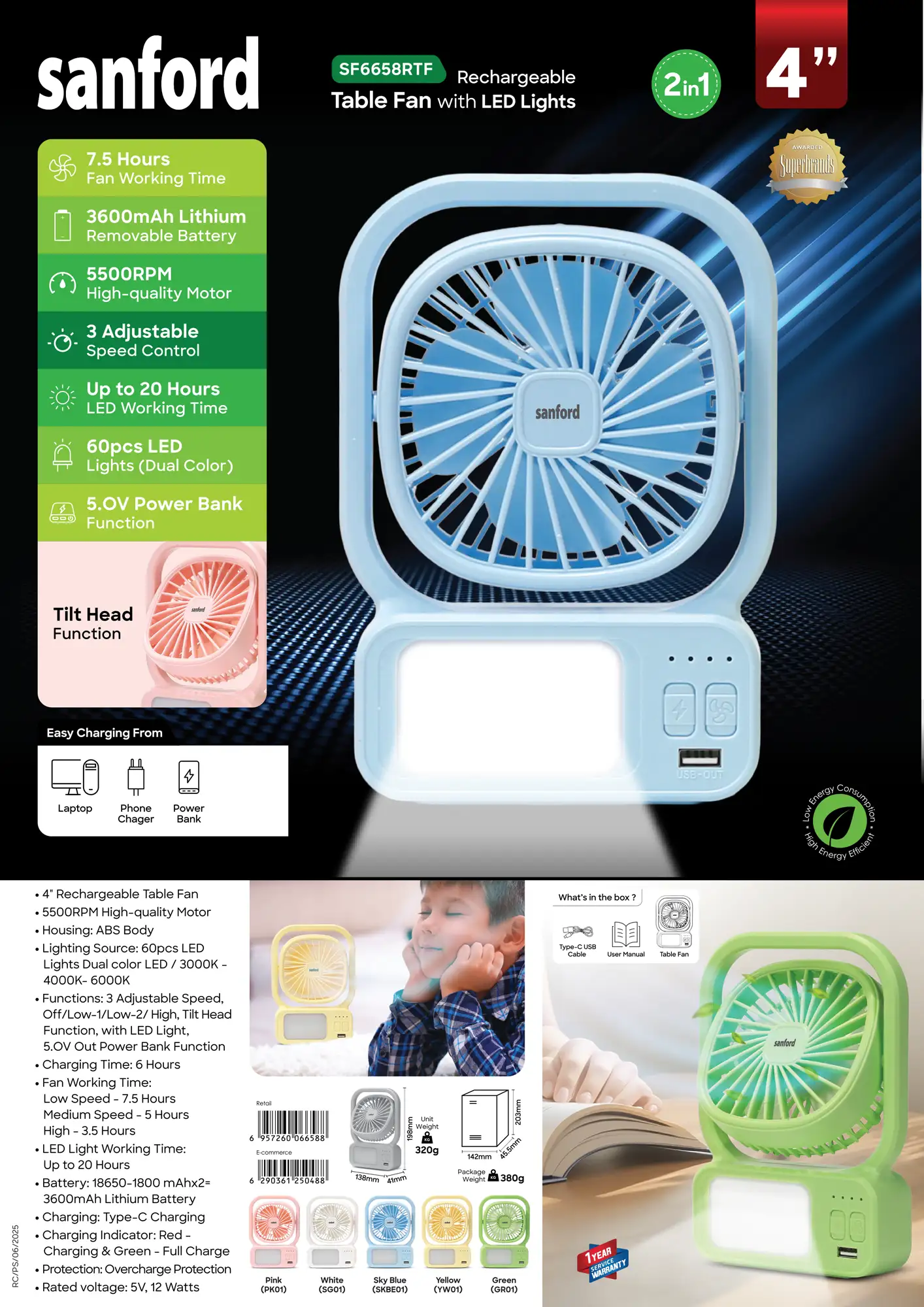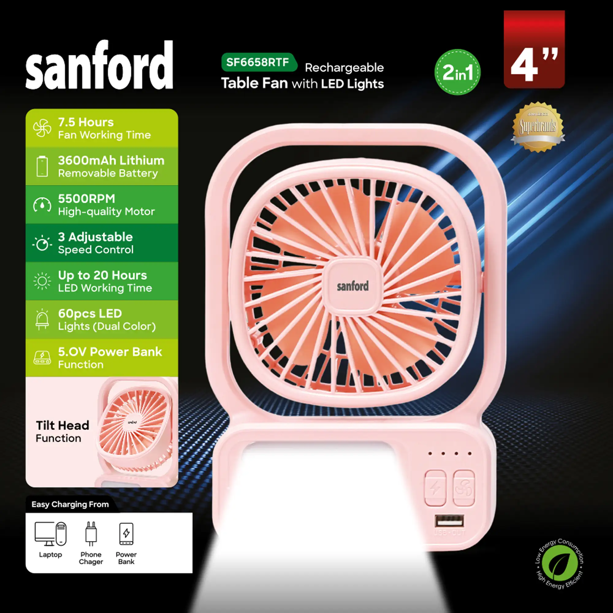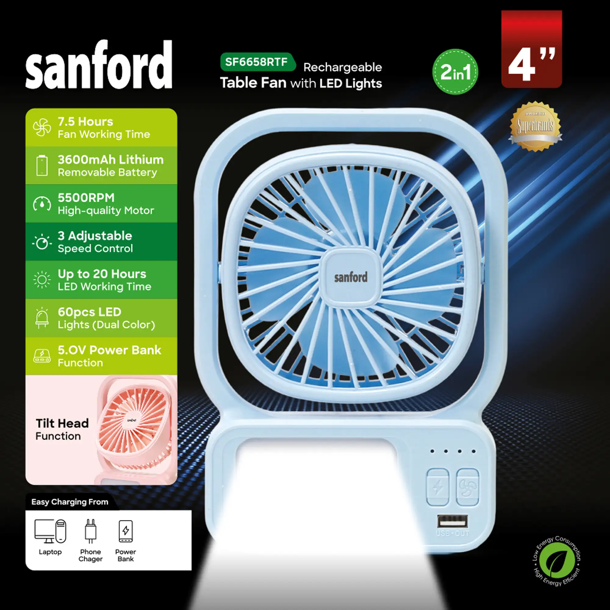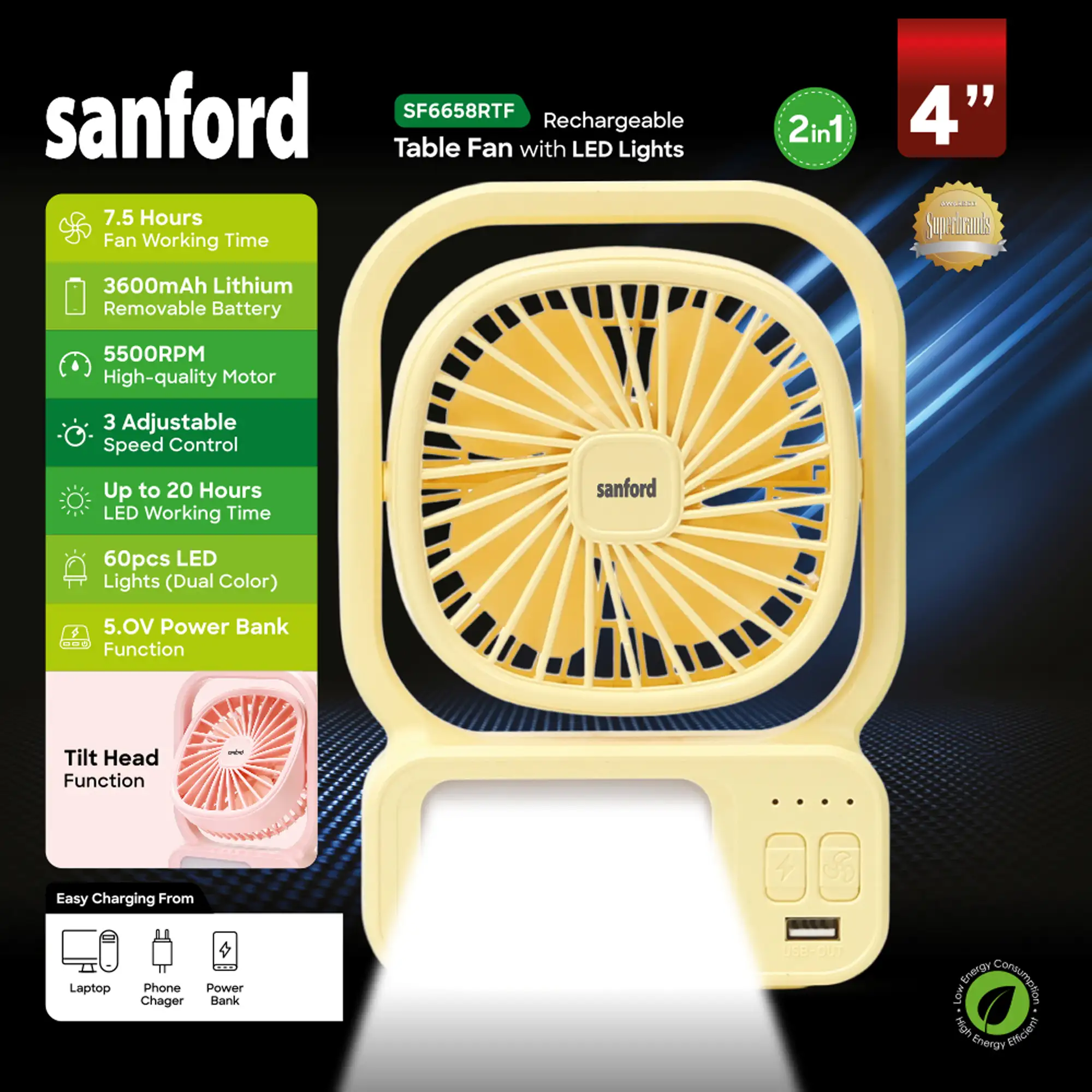 SANFORD 3.7V Rechargeable Fan with 2000mAh Battery and 3-Speed Control SF6658RTF (as per colour available)