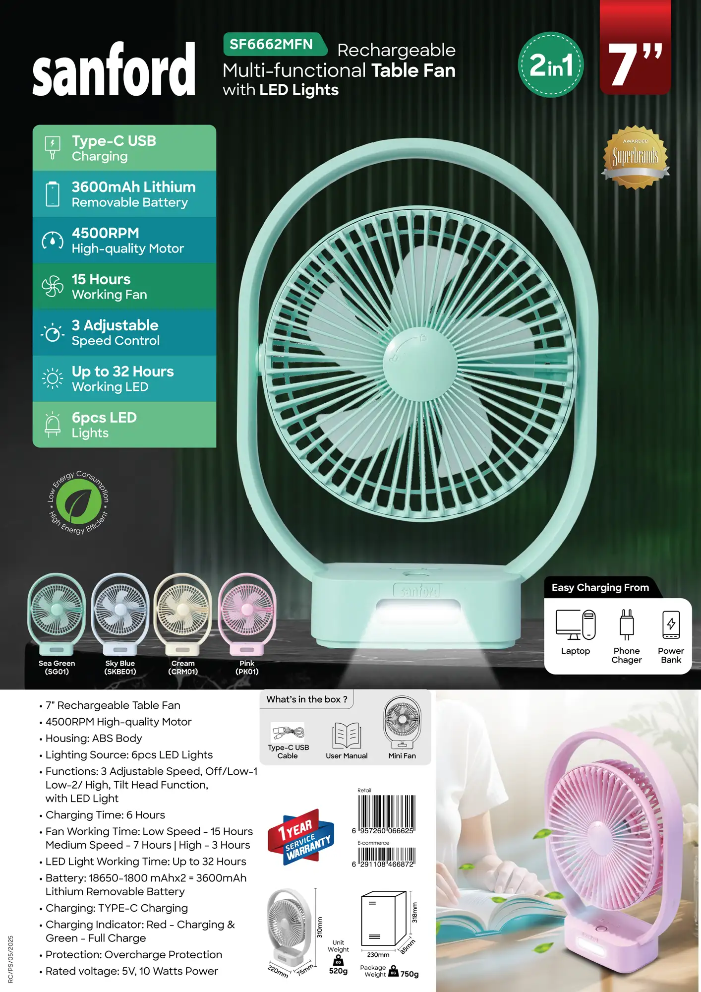 SANFORD Rechargeable Table Fan SF6662MFN | Optional : add Rs 100 get the Hand Fan SF935HFN worth Rs 490