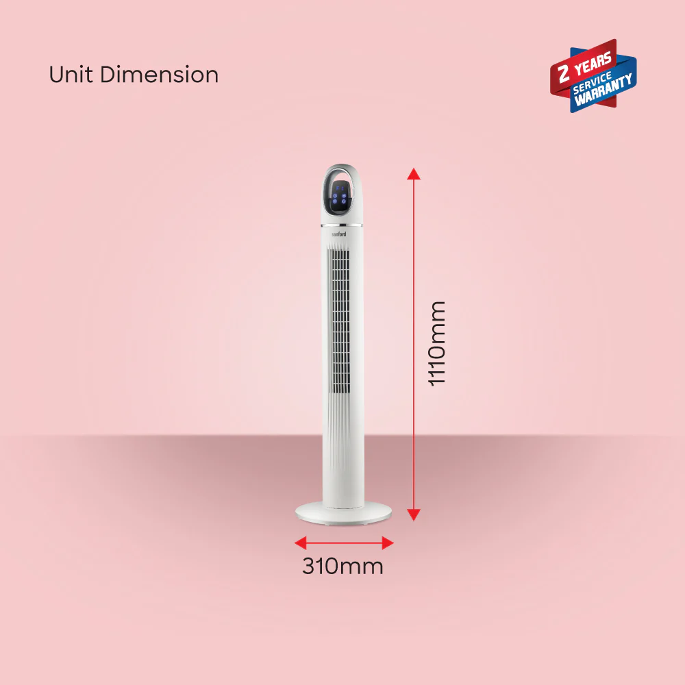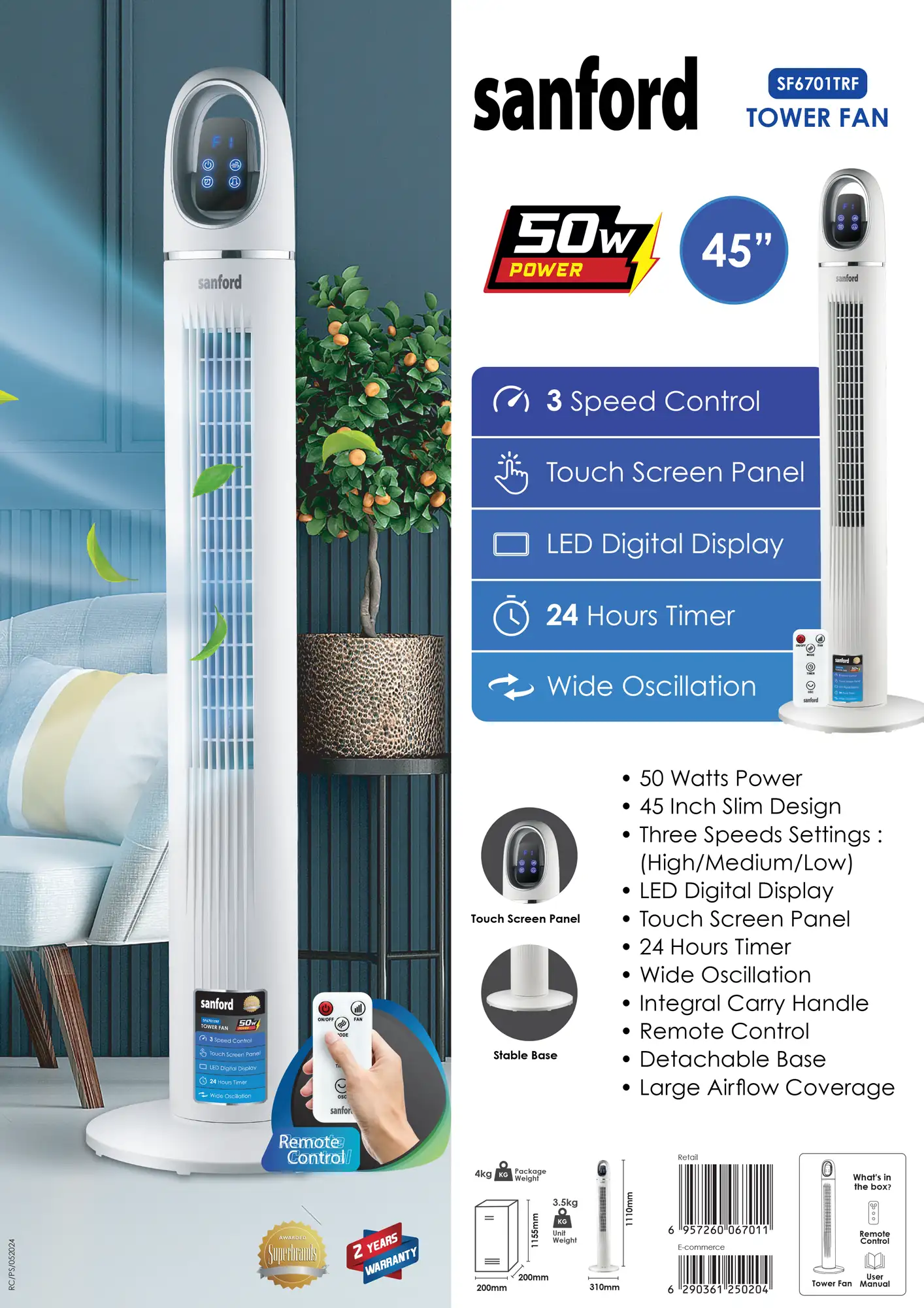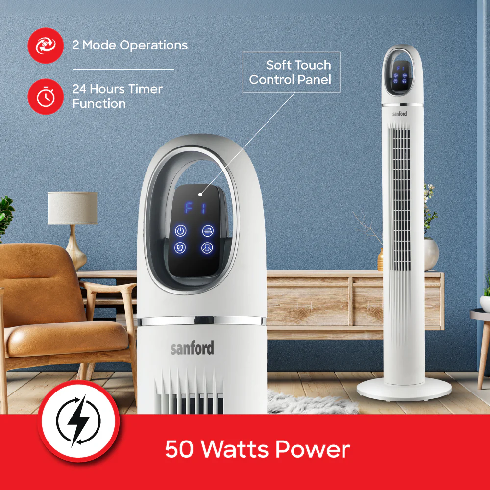 This sleek and modern fan combines power, convenience, and style to keep your space cool and comfortable. With 50 watts of efficient airflow, a slim 45-inch design, and three speed settings (High, Medium, Low), it offers customizable cooling for any environment. The intuitive LED digital display and responsive touch screen panel make operation effortless, while the 24-hour timer ensures energy savings and added convenience. Its wide oscillation distributes airflow evenly across large spaces, and the remote control allows you to adjust settings from a distance. Featuring a detachable base for stability and portability, as well as a built-in carry handle, this fan is designed for easy movement and storage. Enjoy powerful airflow coverage that reaches every corner of the room.