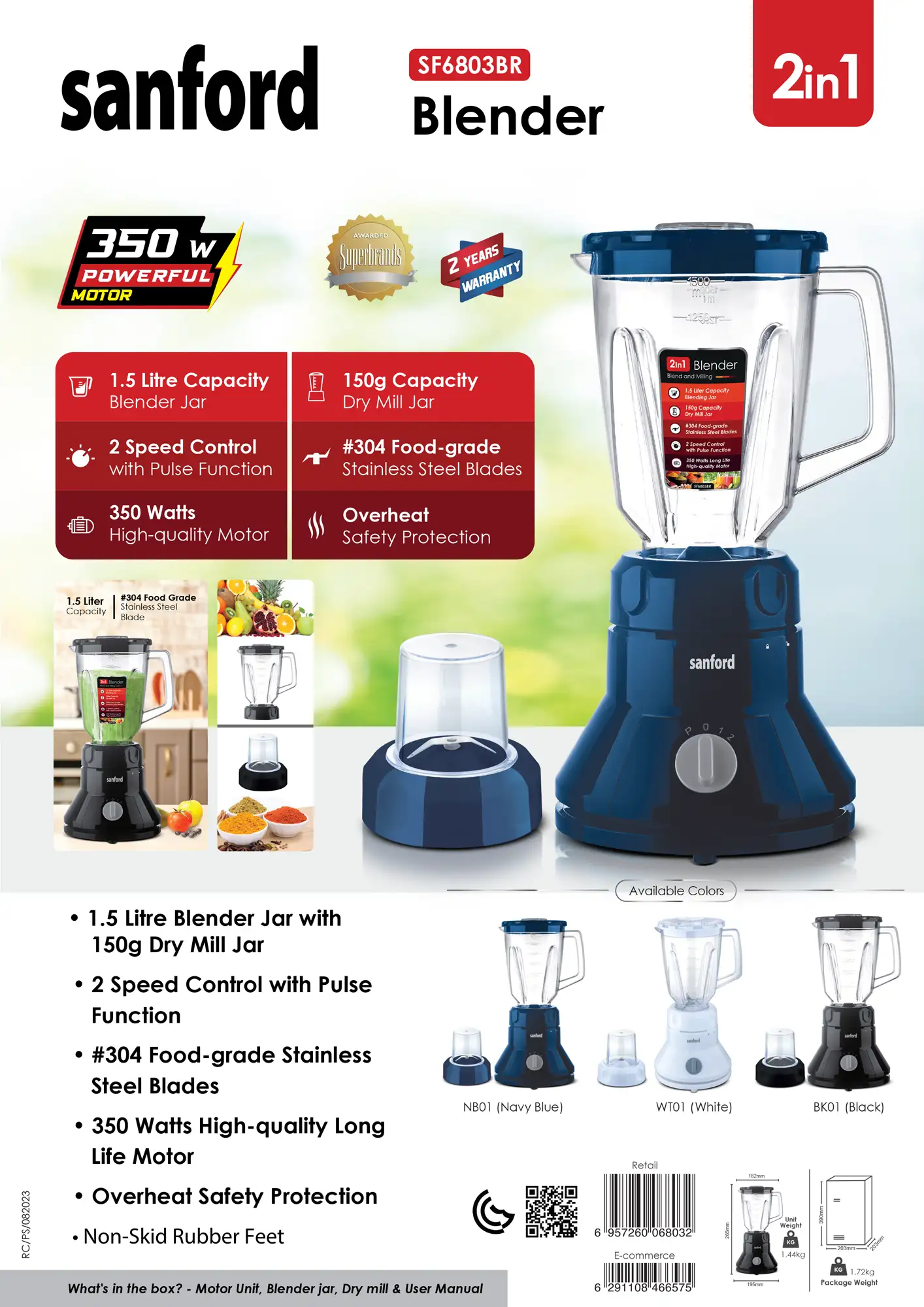 SANFORD 2-in-1 Blender & Grinder | 1.5L Jar | 150g Dry Mill | 2 Speed + Pulse | SS Blades | 350W Motor | Overheat Protection SF6803BR (as per colour available)