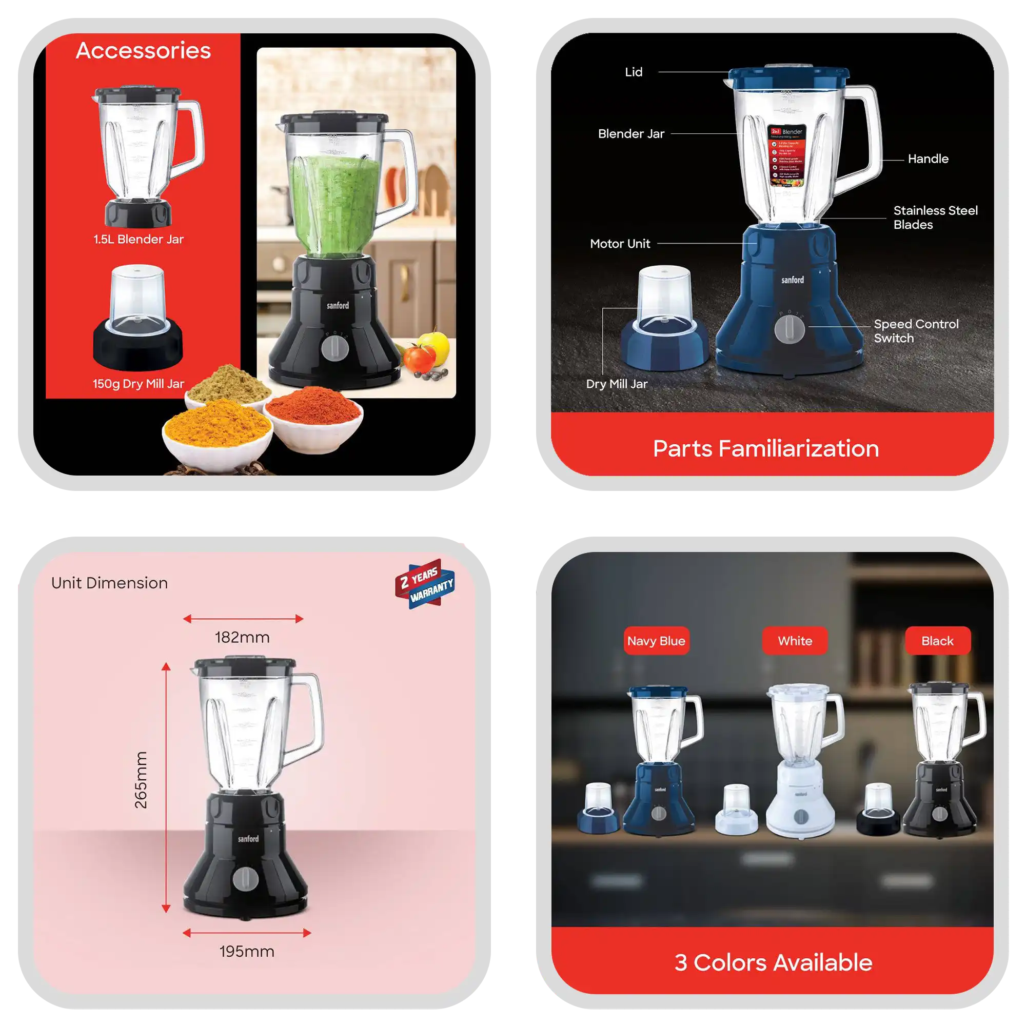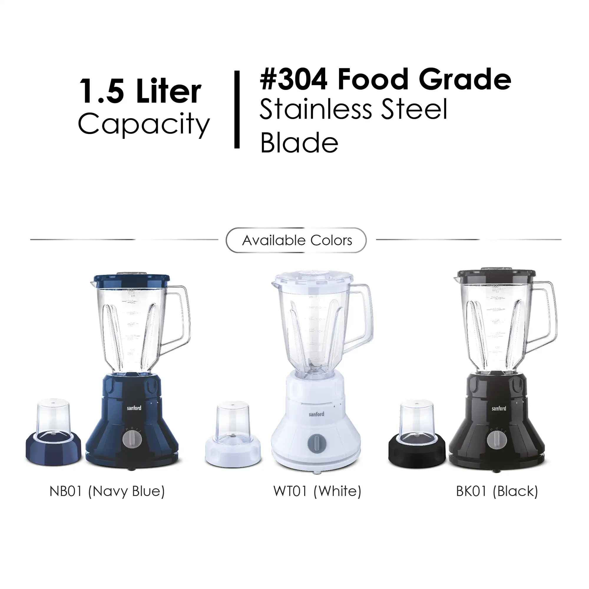 SANFORD 2-in-1 Blender & Grinder | 1.5L Jar | 150g Dry Mill | 2 Speed + Pulse | SS Blades | 350W Motor | Overheat Protection SF6803BR (as per colour available)