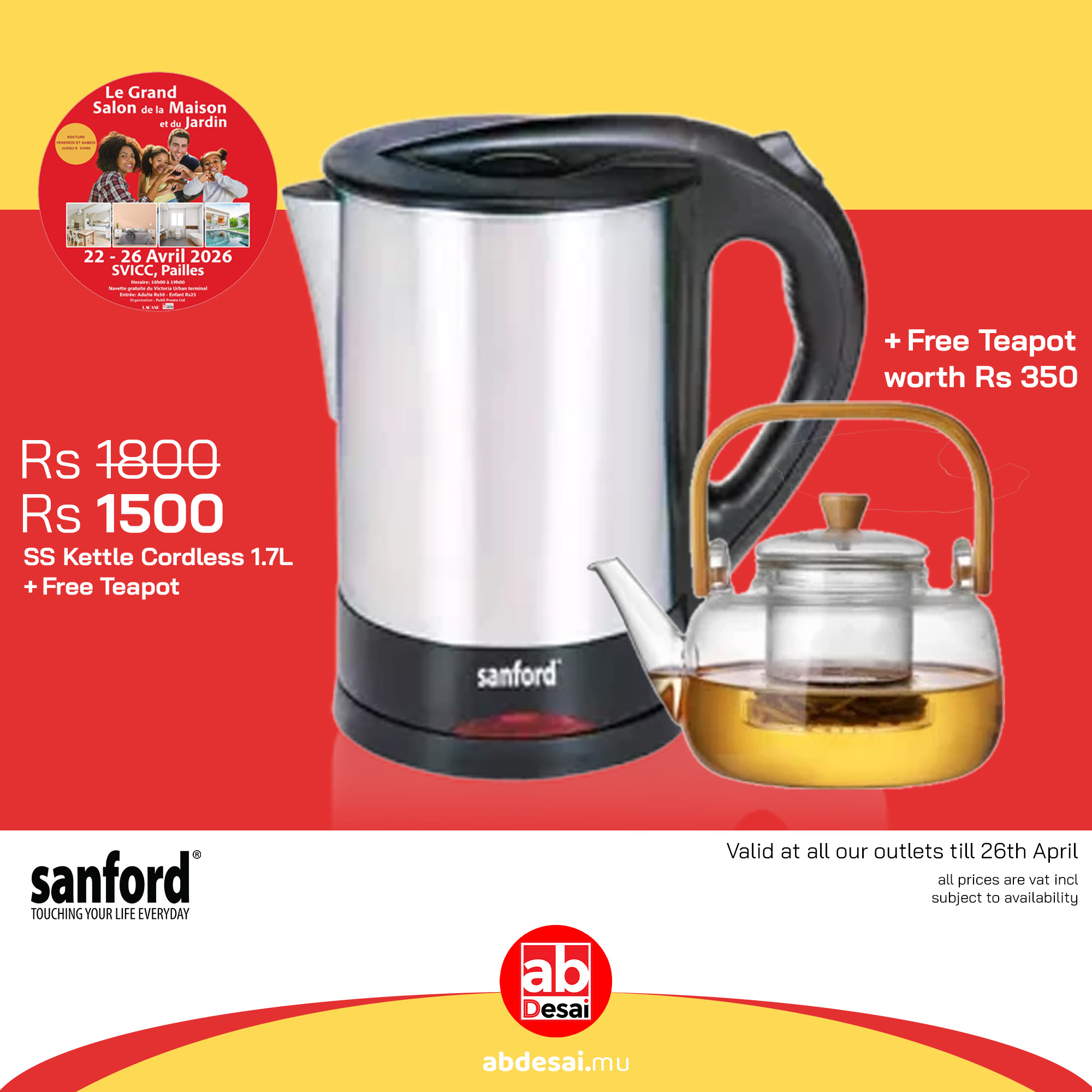 SANFORD Kettle Stainless Steel 1.7L SF860EK + Free Teapot ABD24037