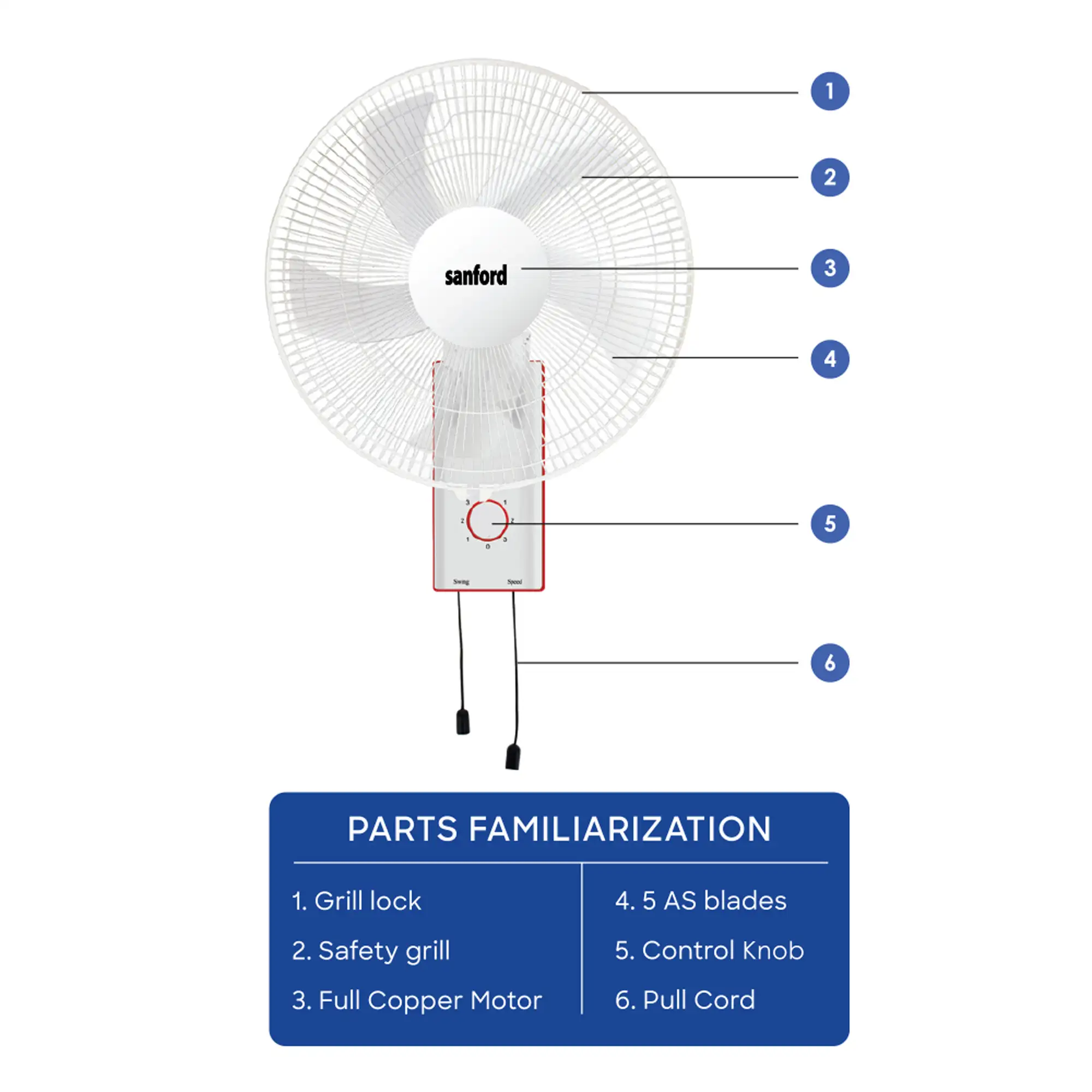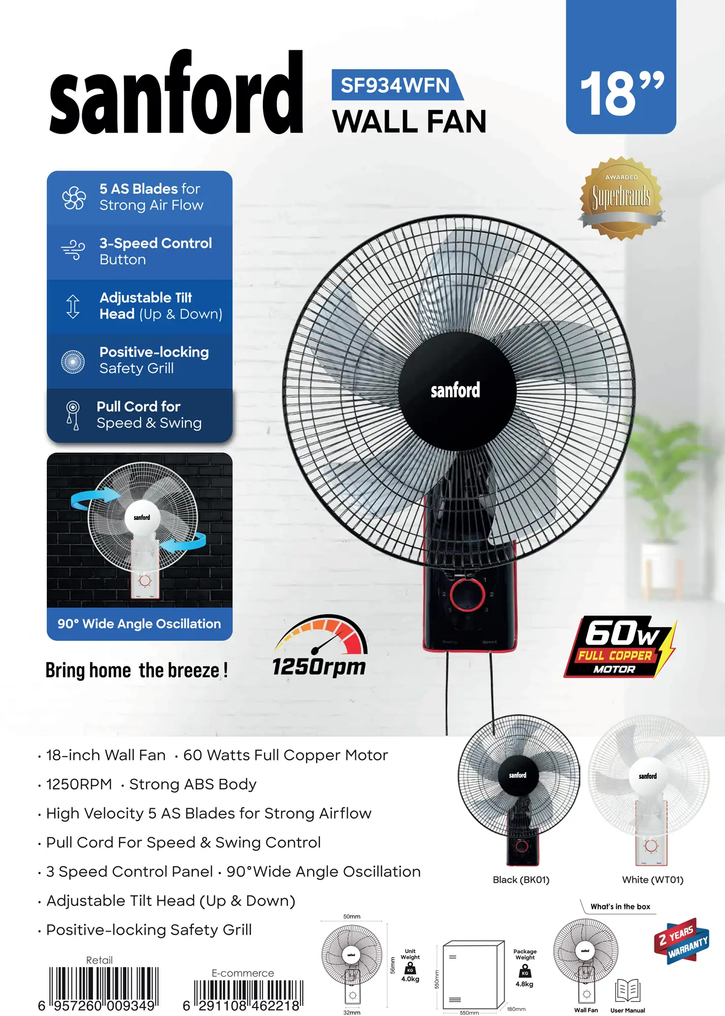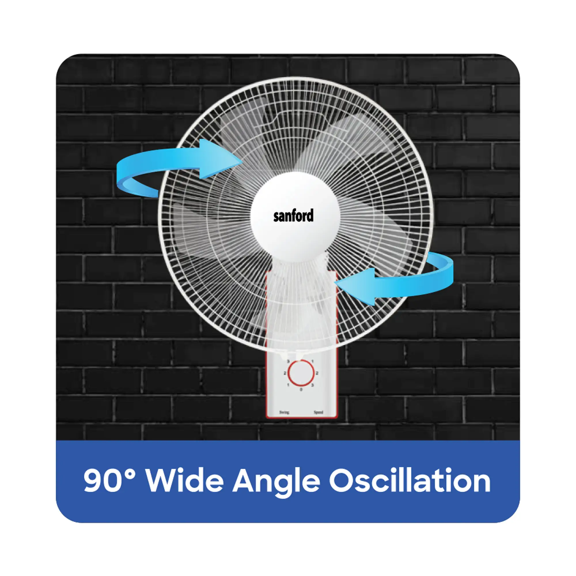 SANFORD 18” Wall Fan | 60W Full Copper Motor | 1250 RPM | 5 AS Blades | 3-Speed + Oscillation | Tilt Head | ABS Body | SF934WFN + Free Hand Fan SF936HFN-Square worth Rs 590
