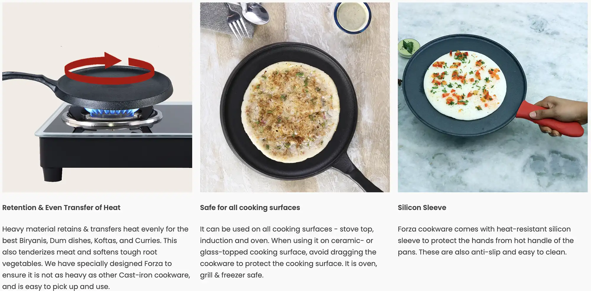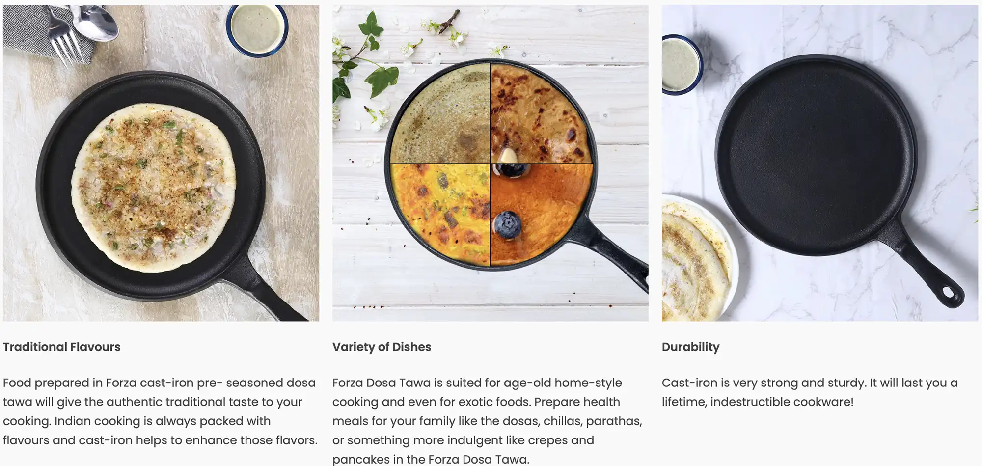 Make the most flavoursome meals with the Forza pre-seasoned Cast-Iron Dosa Tawa Pans. Enjoy the traditional taste of food with unmatched health benefits in Cast-Iron cookware. And now with lifetime warranty for the Forza cast-iron cookware it gets even more special. The Forza range is now covered for 25 long years against manufacturing defects, breakage and cracks.