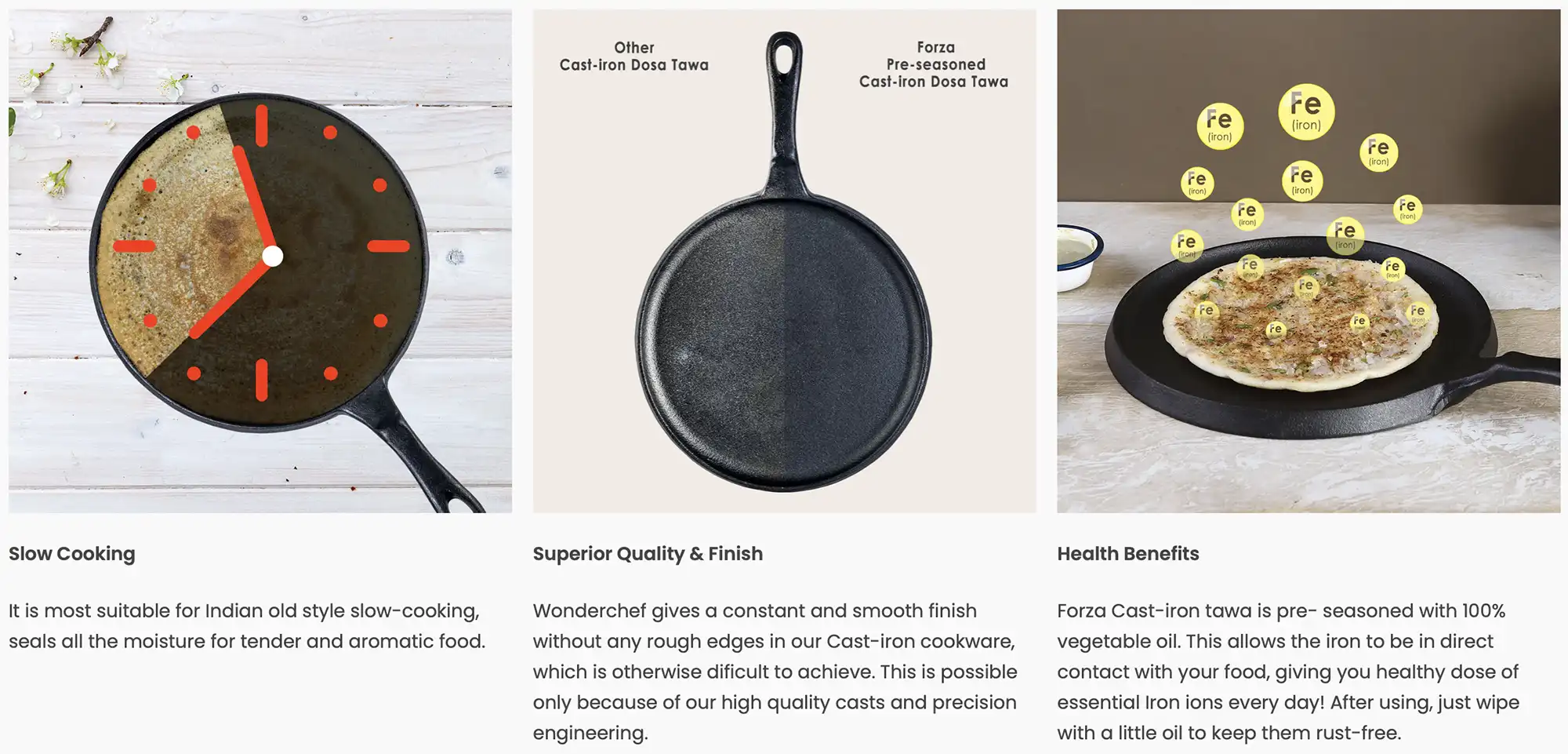 - It is difficult to achieve a constant and smooth finish without any rough edges in a Cast-Iron pan. It requires very high-quality casts and precision engineering. Wonderchef offers you that level of finish and quality in its Cast–Iron. The sturdy handle gives a firm grip, easy to hold and move the pan around. We have specially designed Forza to ensure that it is not as heavy as other Cast – Iron cookware, making it easy to pick up and use.