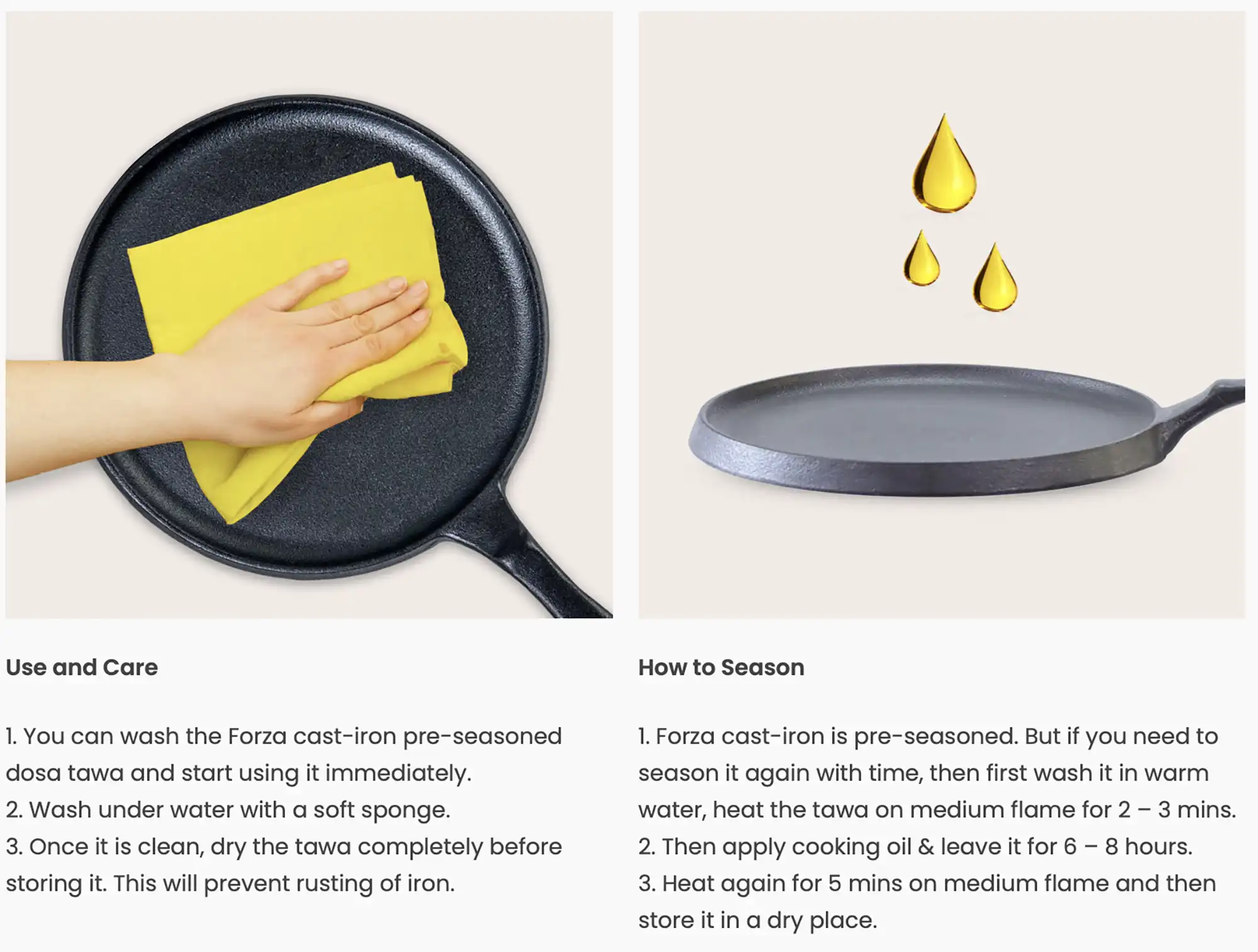Keep your FORZA Cast-iron rust-free: Pre-Season before use. Ensure to apply vegetable oil while storing the pans to keep them pristine.