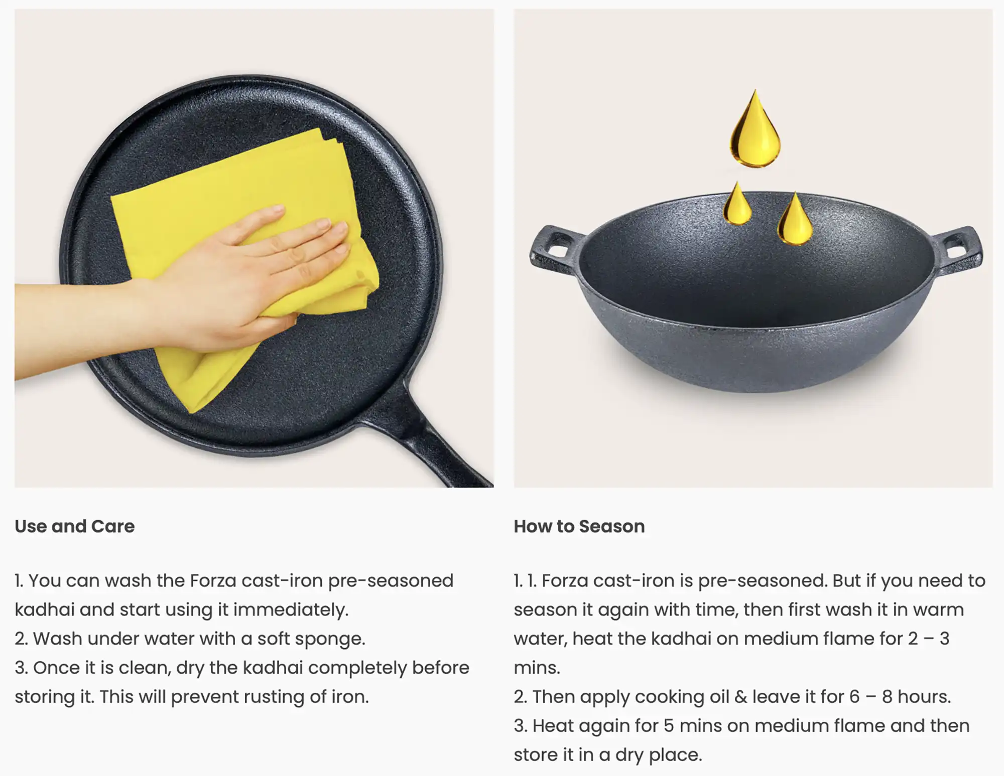 - Keep your FORZA Cast-iron rust-free: The tawa is pre-seasoned with 100% vegetable oil, allowing direct iron contact with food to get your essential dose of ferrous ions! Ensure to apply vegetable oil while storing the pans to keep them pristine.
