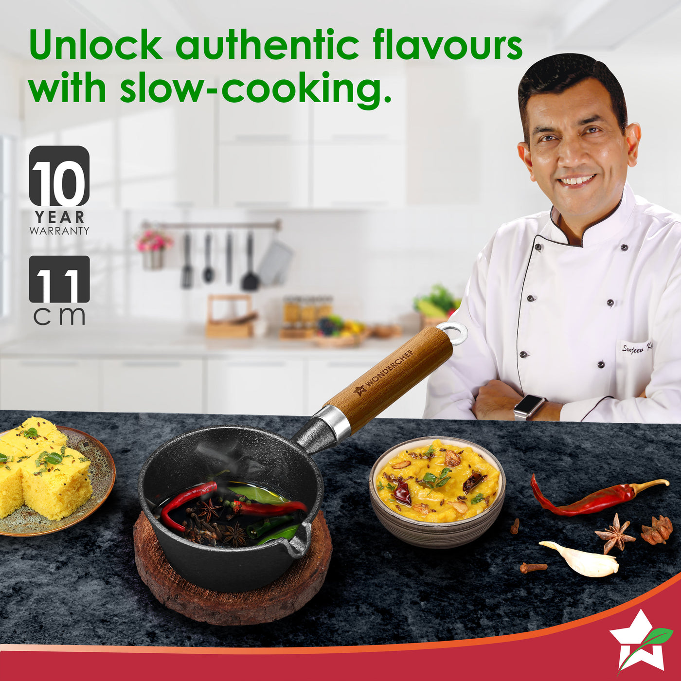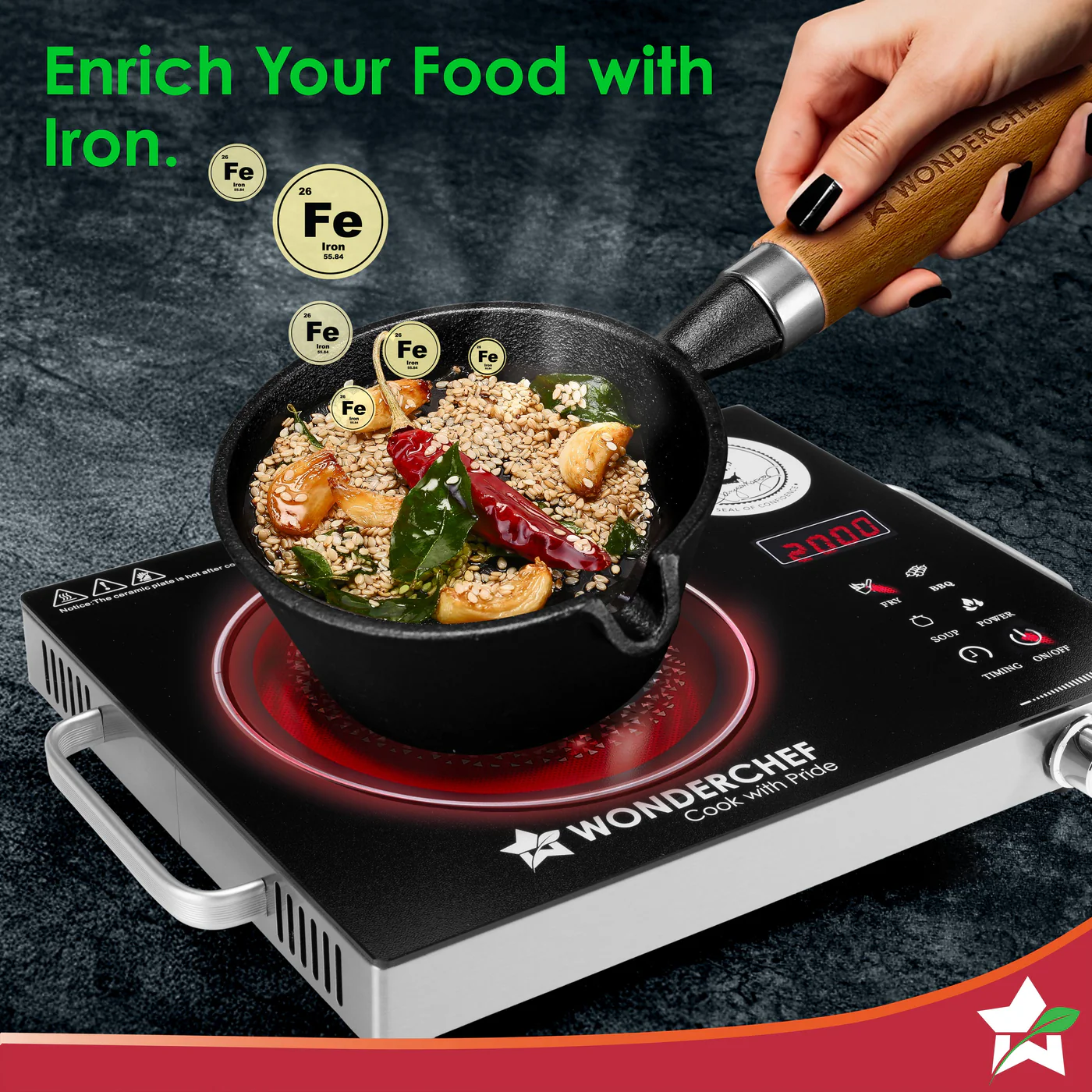 WONDERCHEF Ferro Light-weight Cast-iron Tadka Pan for Tempering, 40% Lighter, Pre-seasoned with 100% Vegetable Oil, Chemical-free, Induction-friendly, Long Cool-touch Wood Handles, 10-Yr Warranty WON781-63155163