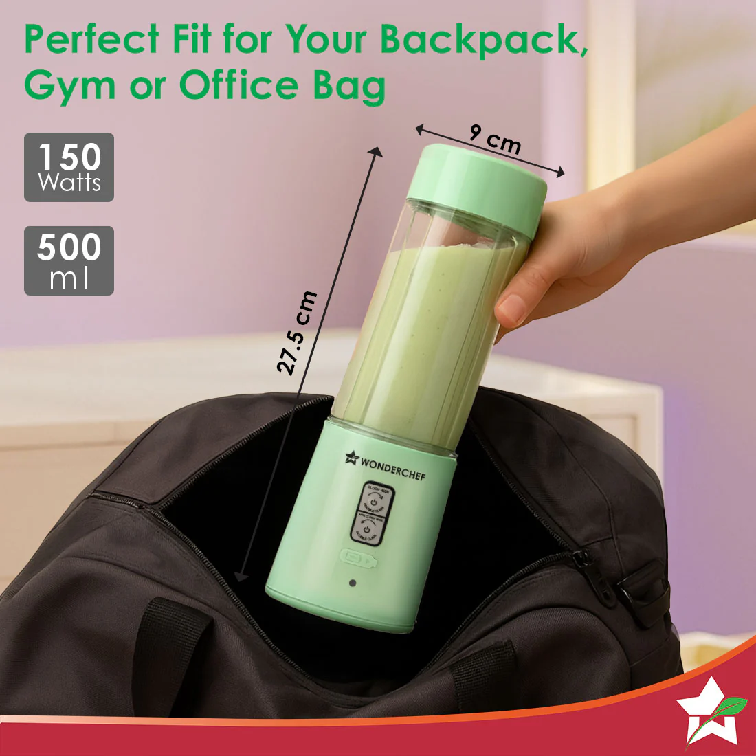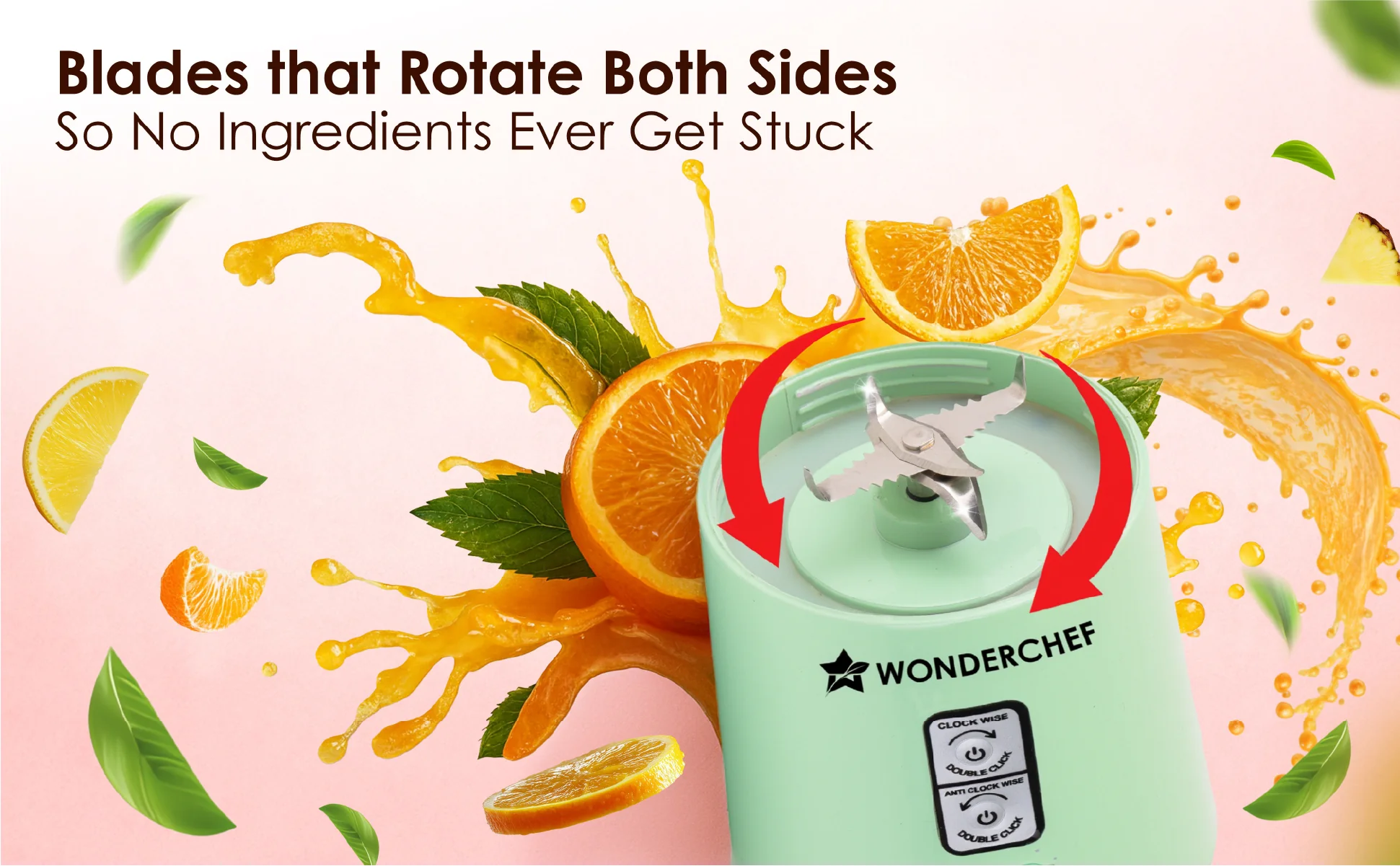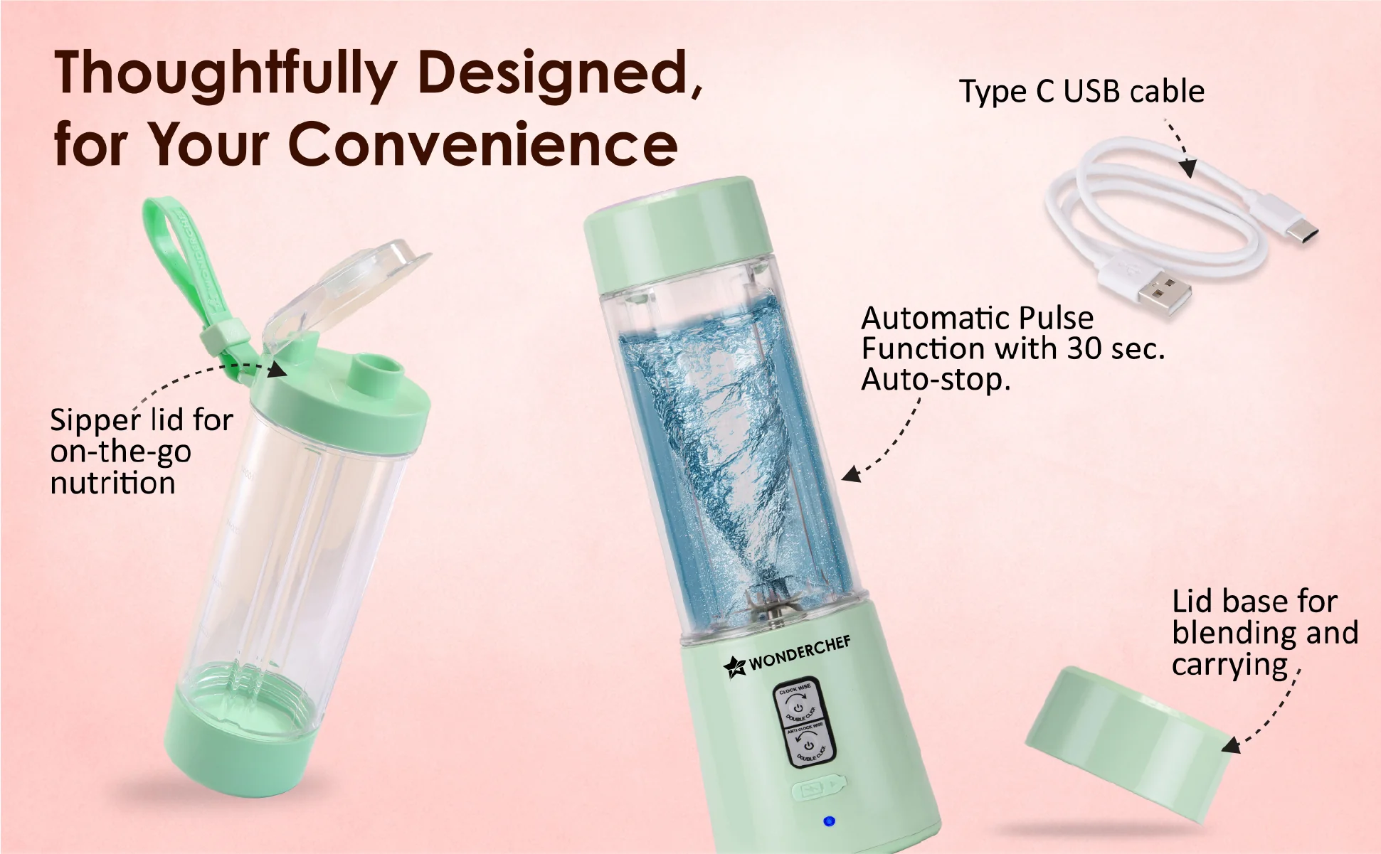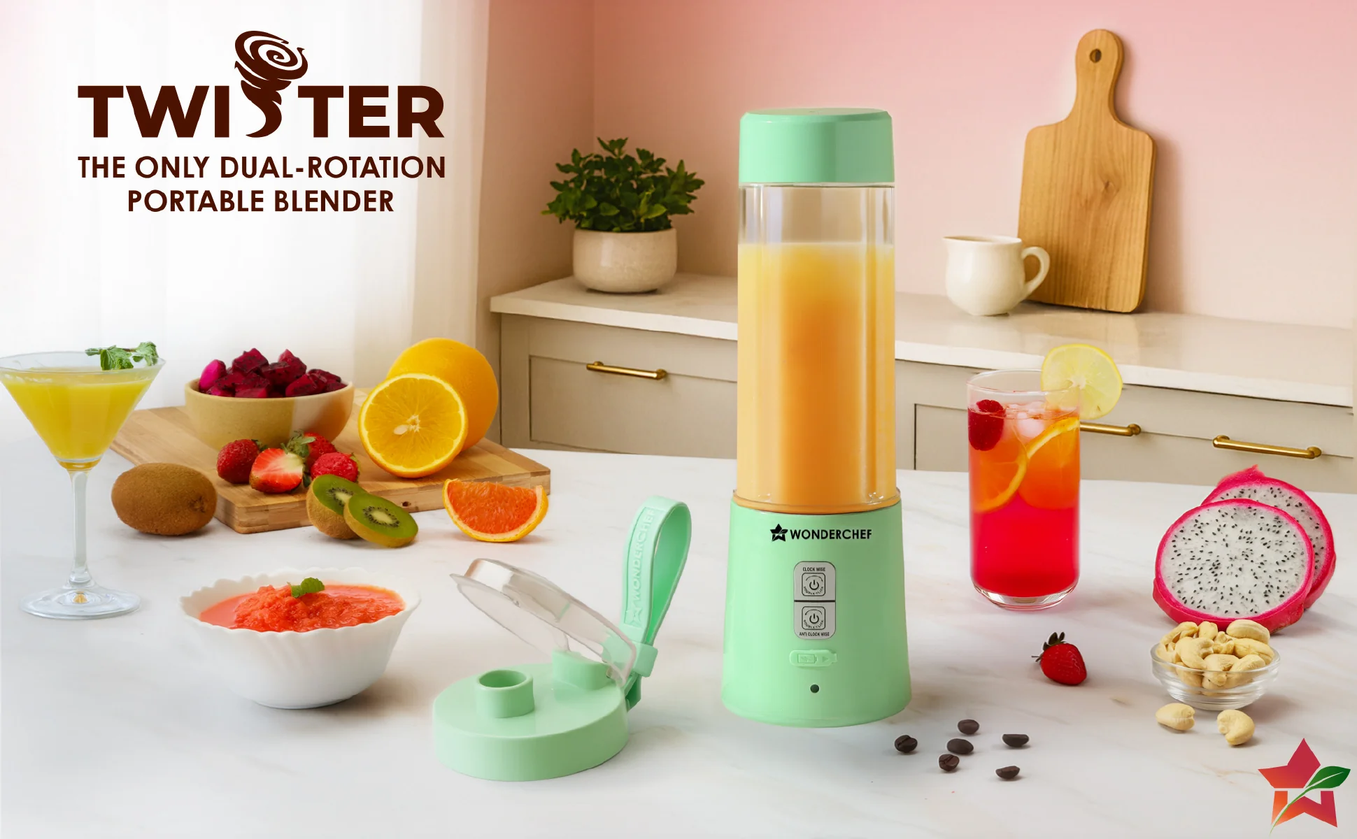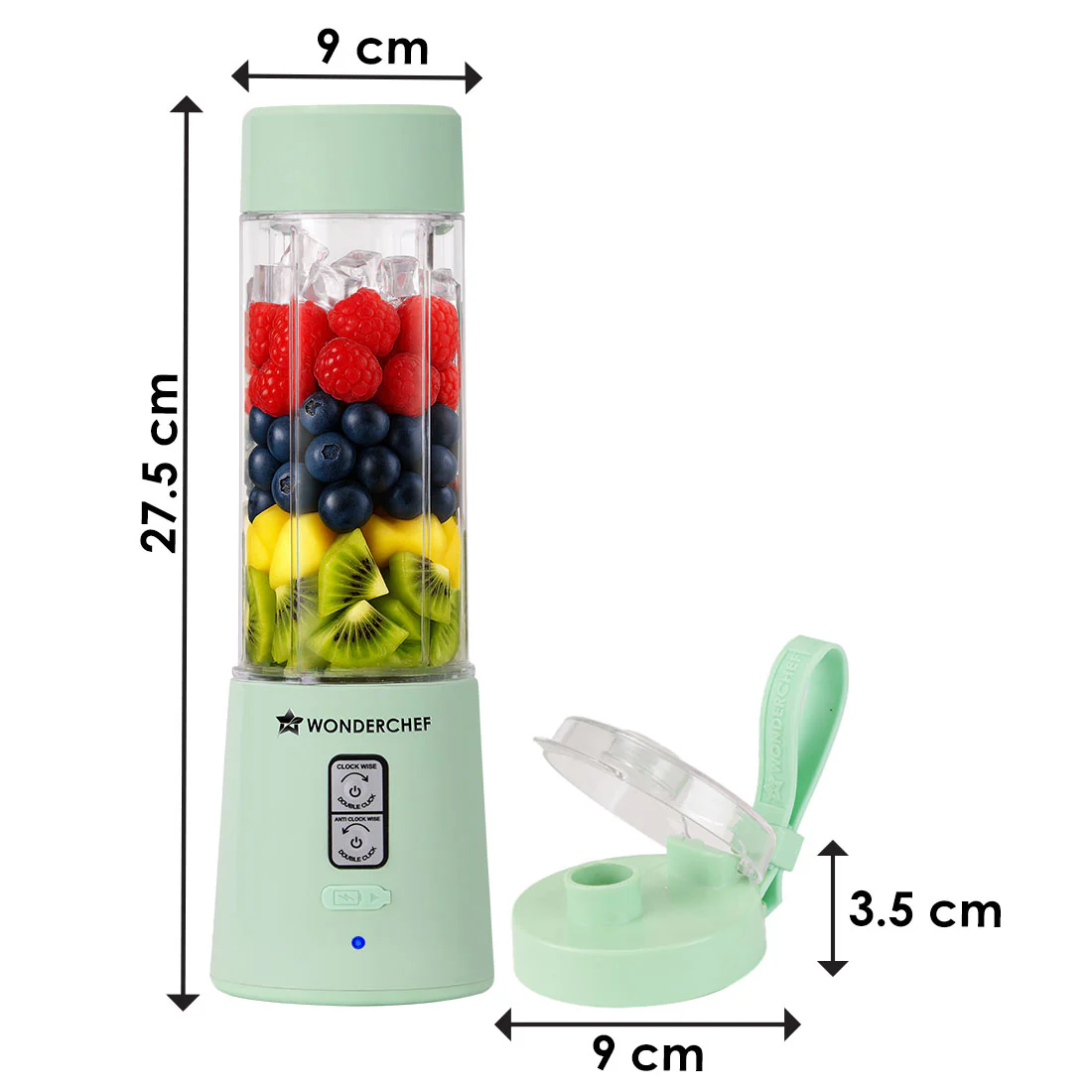 WONDERCHEF Twister Portable Blender, 500ml, Dual-rotation Stainless-steel Blades, For Crushing Ice, Smoothies, Shakes, Salad Dressings, For Backpacks/Office Bags, Type-c Charge, 1-Yr Warranty, Mint Green WON784-63155202
