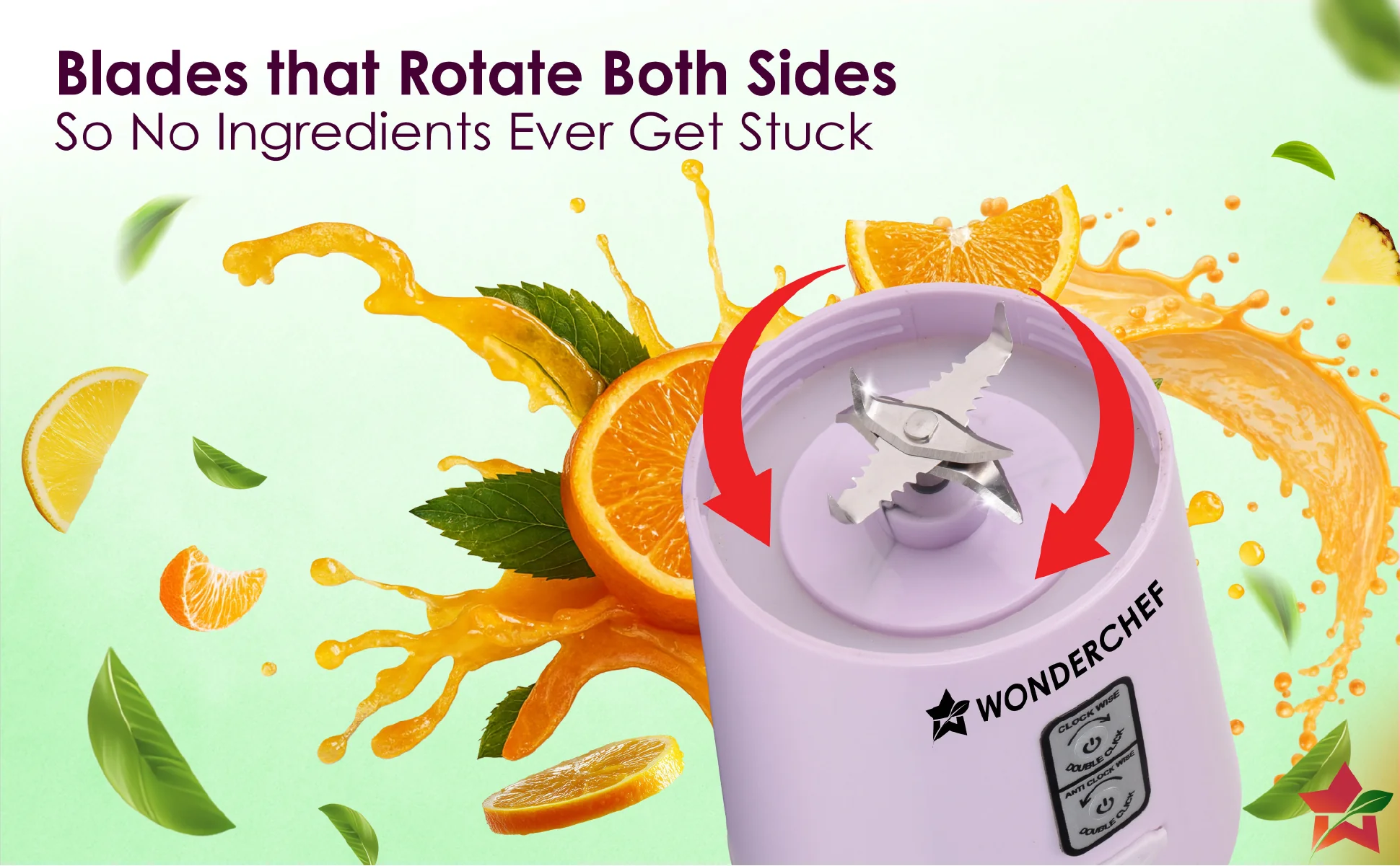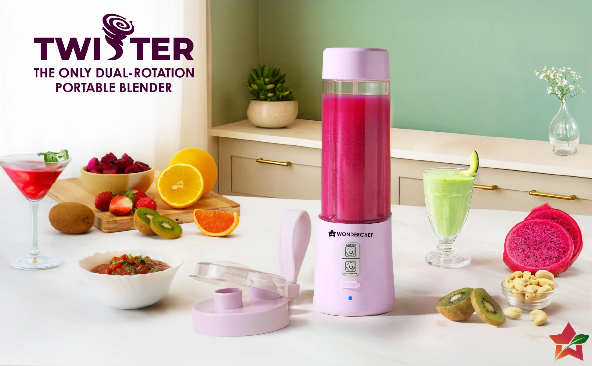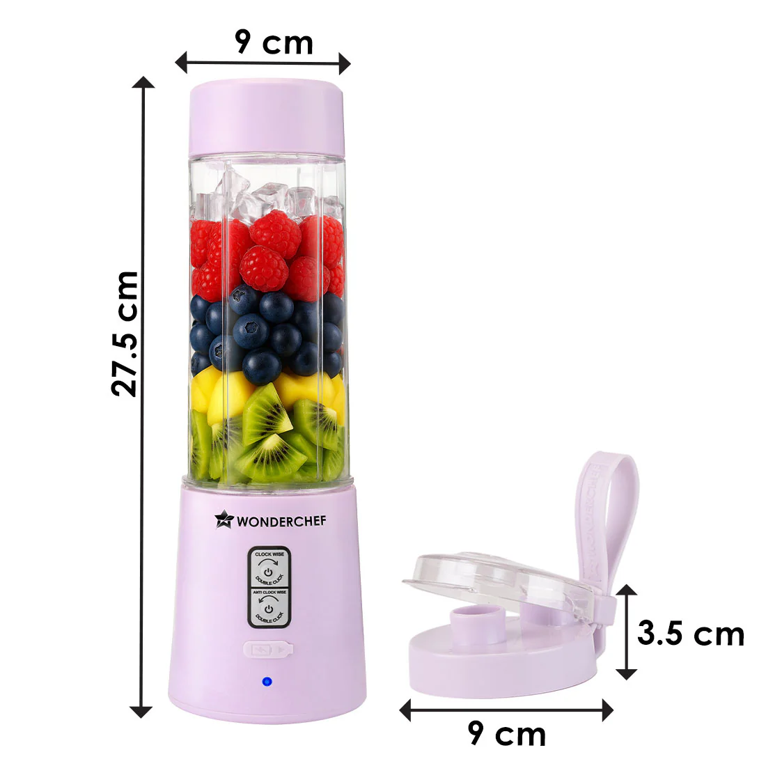 WONDERCHEF Twister Portable Blender, 500ml, Dual-rotation Stainless-steel Blades, For Crushing Ice, Smoothies, Shakes, Salad Dressings, For Backpacks/Office Bags, Type-c Charge, 1-Yr Warranty, Lavender WON785-63155201