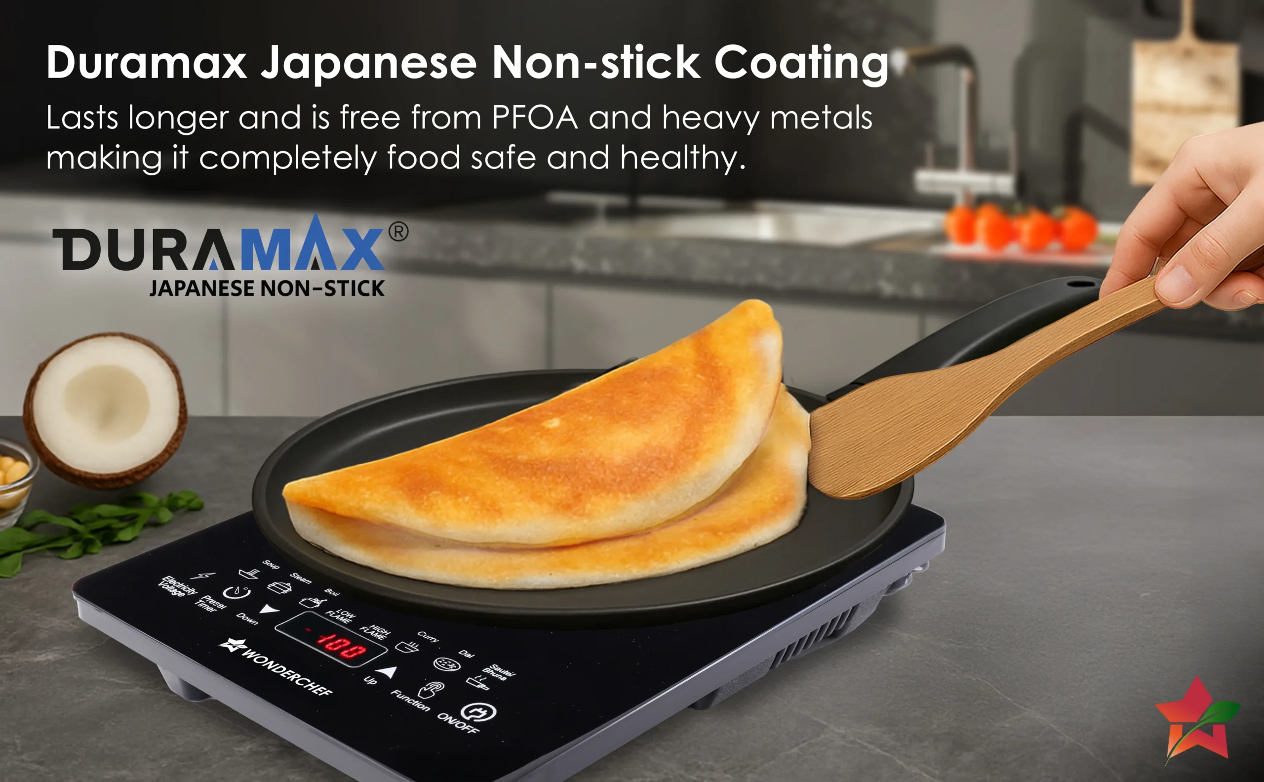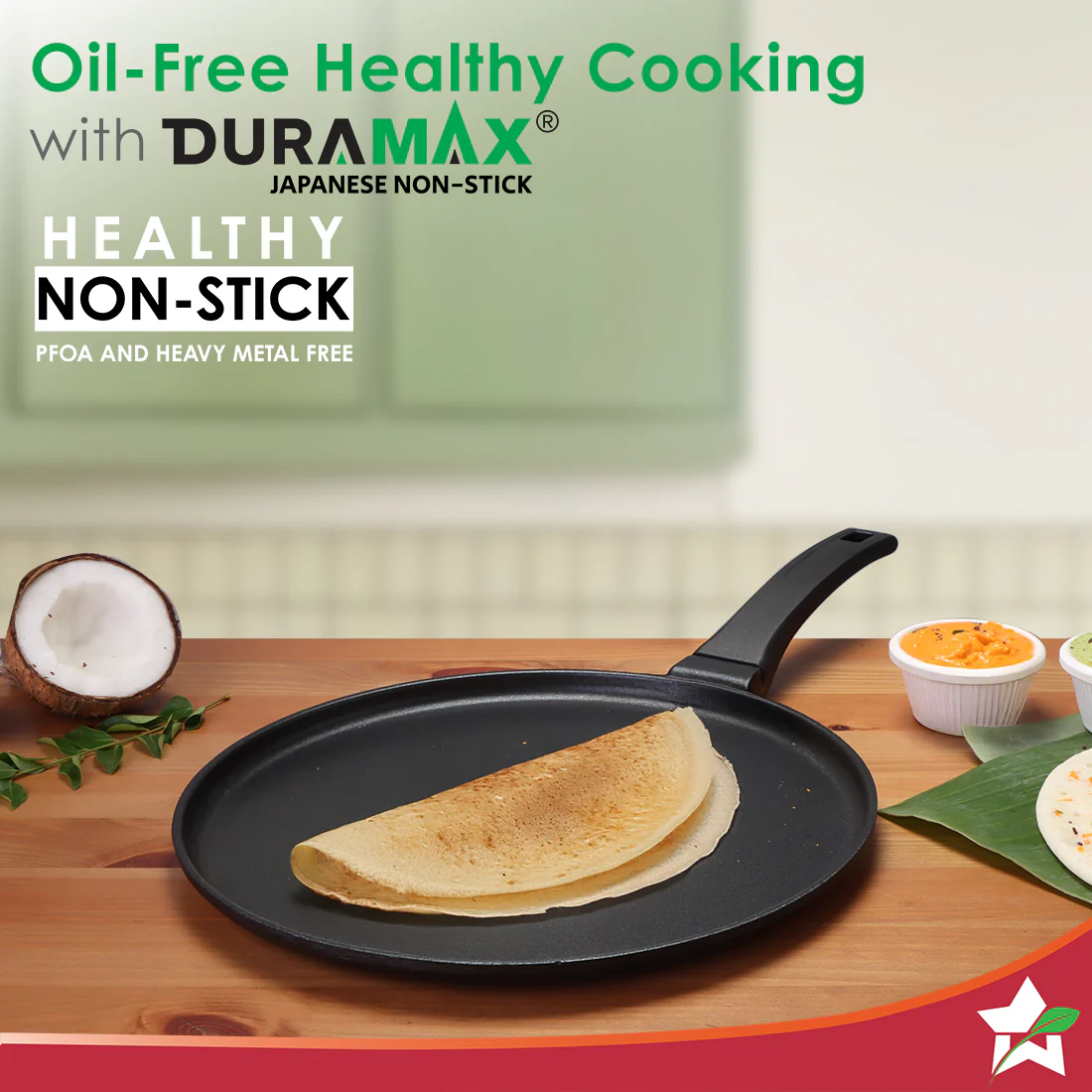 - COOK WITH MINIMAL OIL: Food release properties of Duramax coating over die-cast tawa are superb and enable you to cook with just a few drops of oil.