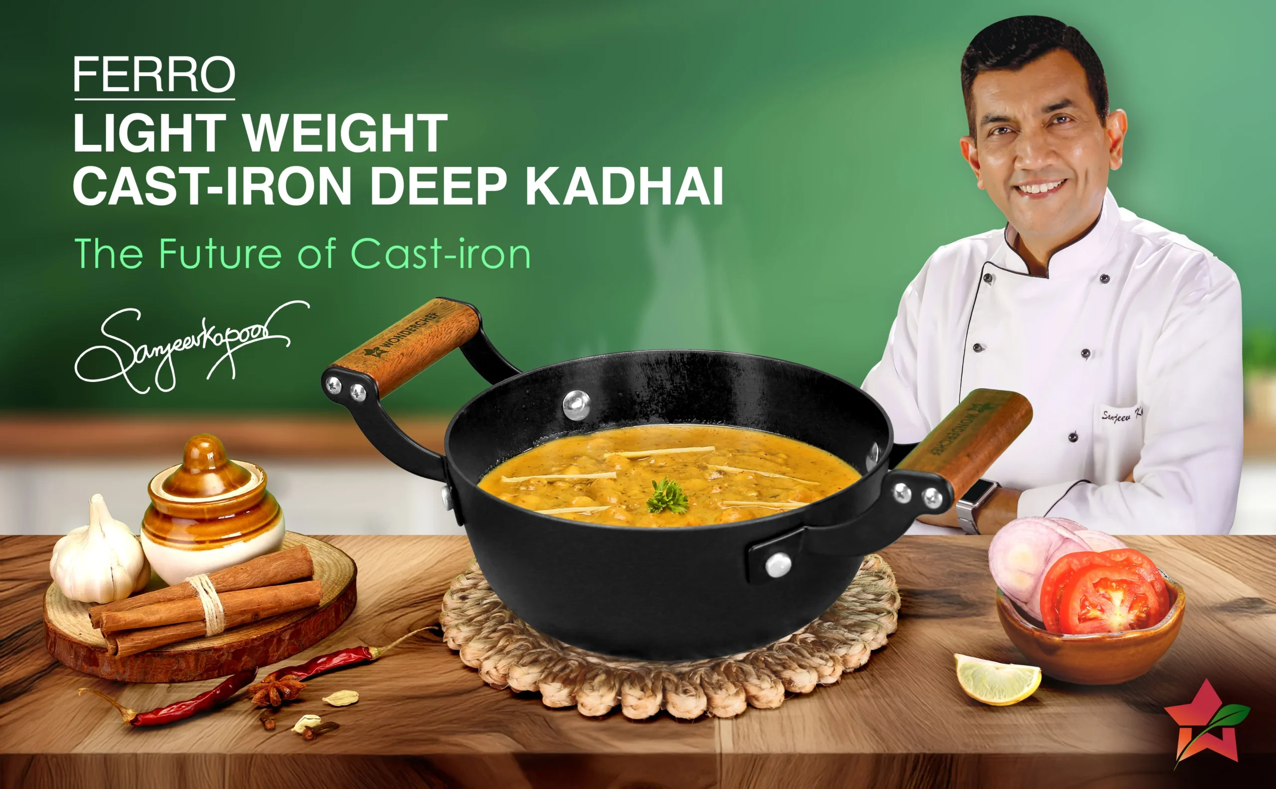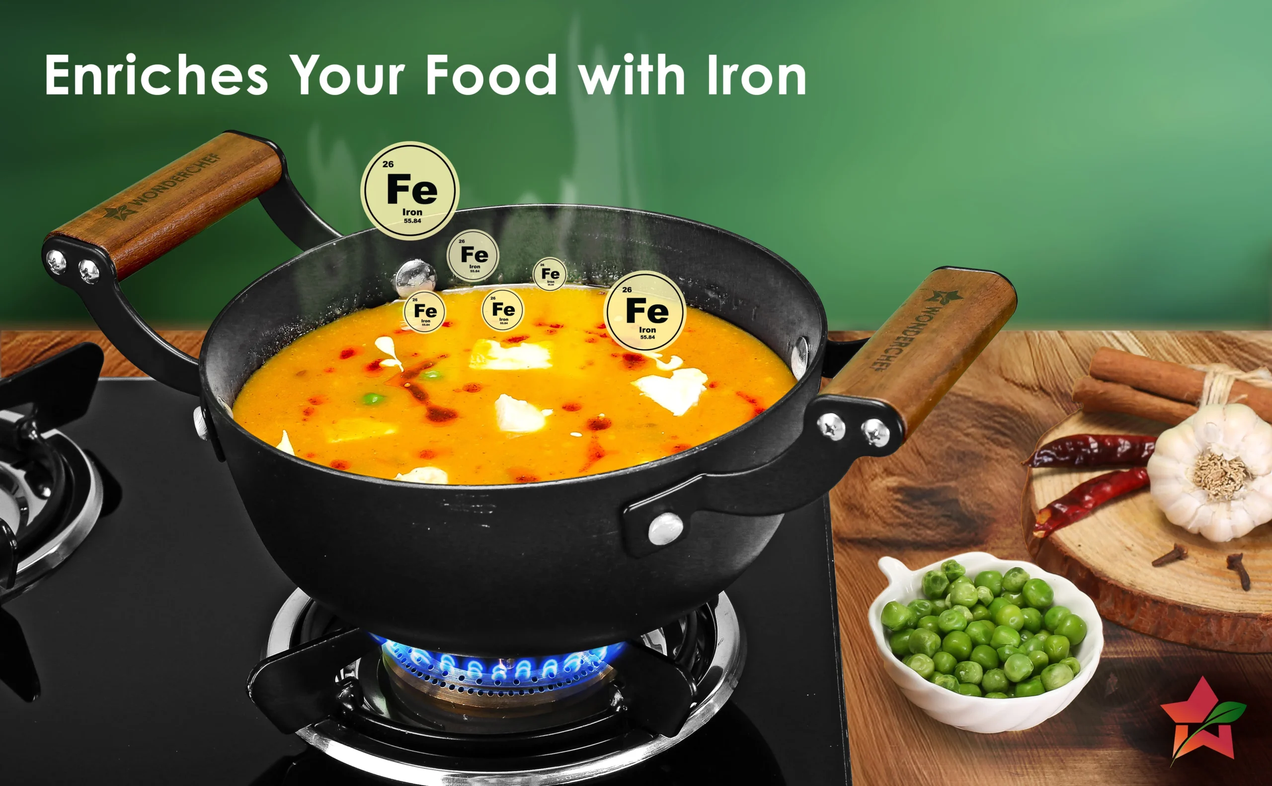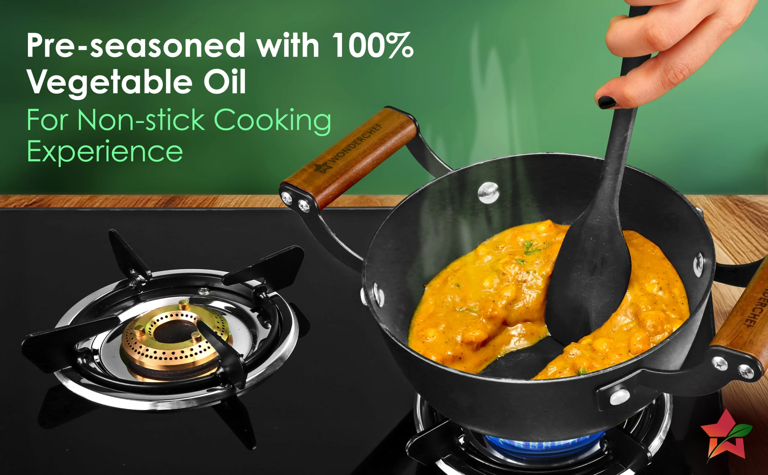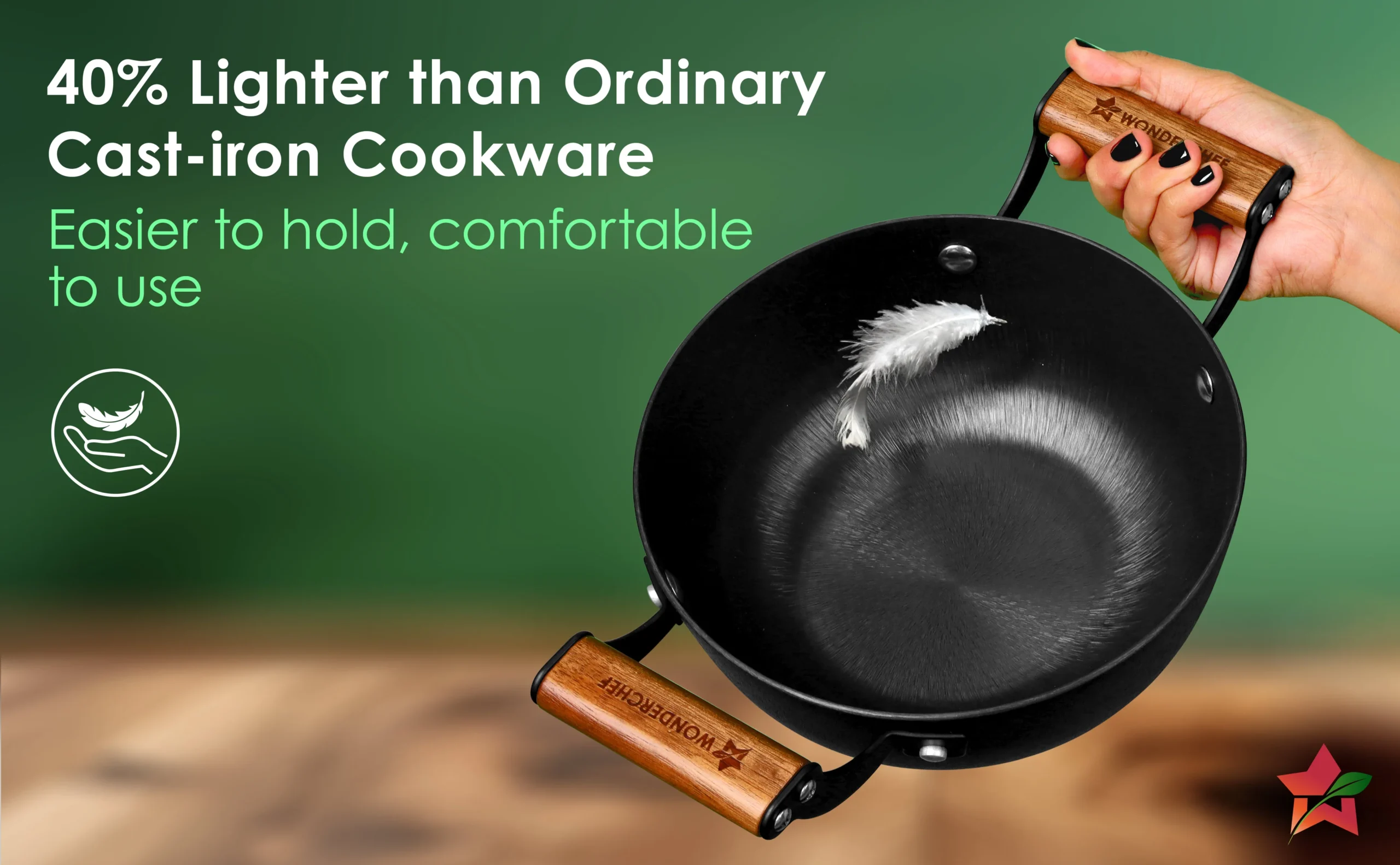 WONDERCHEF Ferro Light-weight Cast-iron Deep Kadhai, 20cm, 40% Lighter, Pre-seasoned with 100% Vegetable Oil, Non-toxic, Chemical-free, Induction-friendly, Long Cool-touch Wood Handles, 10-Yr Warranty WON792-63155161