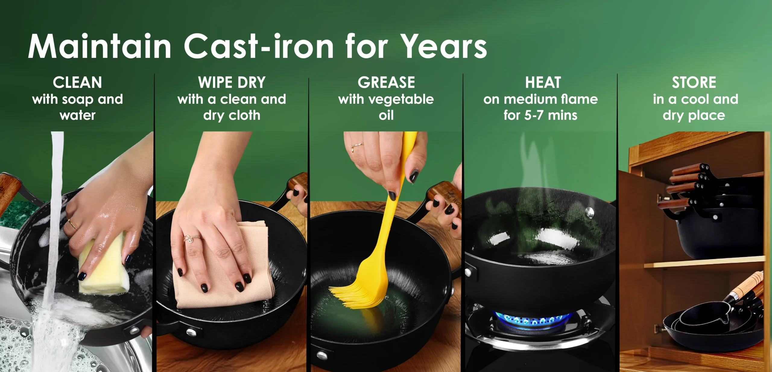 - EASY TO MAINTAIN: How to keep your cast-iron pans rust-free – Wash the pan thoroughly after use. Season the surface of the pan with vegetable oil and heat for 5-7 minutes. Store in a cool and dry place.