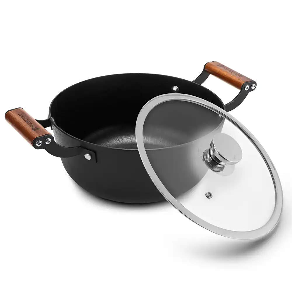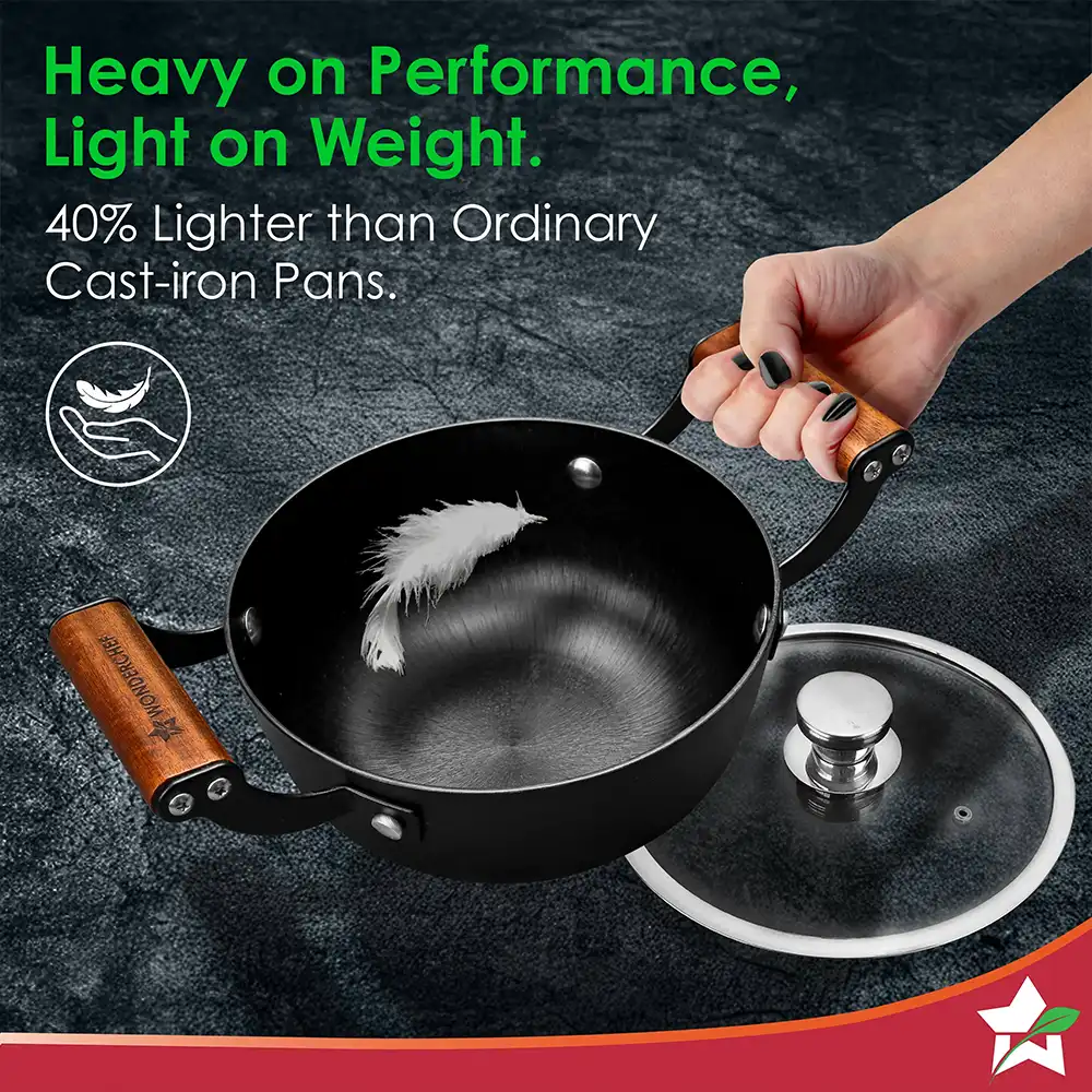 WONDERCHEF Ferro Light-weight Cast-iron Casserole & Glass Lid, 24cm, 40% Lighter, Pre-seasoned with 100% Vegetable Oil, Chemical-free, Induction-friendly, Long Cool-touch Wood Handles, 10-Yr Warranty WON794-63155162
