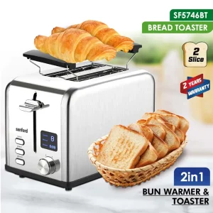 Features 2 Slice Stainless Steel Toaster. 38mm Side Slots: 120 x 120mm Bread. Extra Lifting Function. Self-centerting Function. Defrost, Reheat, Cancel Settings with Blue LED Lighting. 6 Variable Electronic Browning Control. Crumb Tray for Easy Cleaning. LED Digital Display. 1050 Watts. Register online: Warranty 2 years.